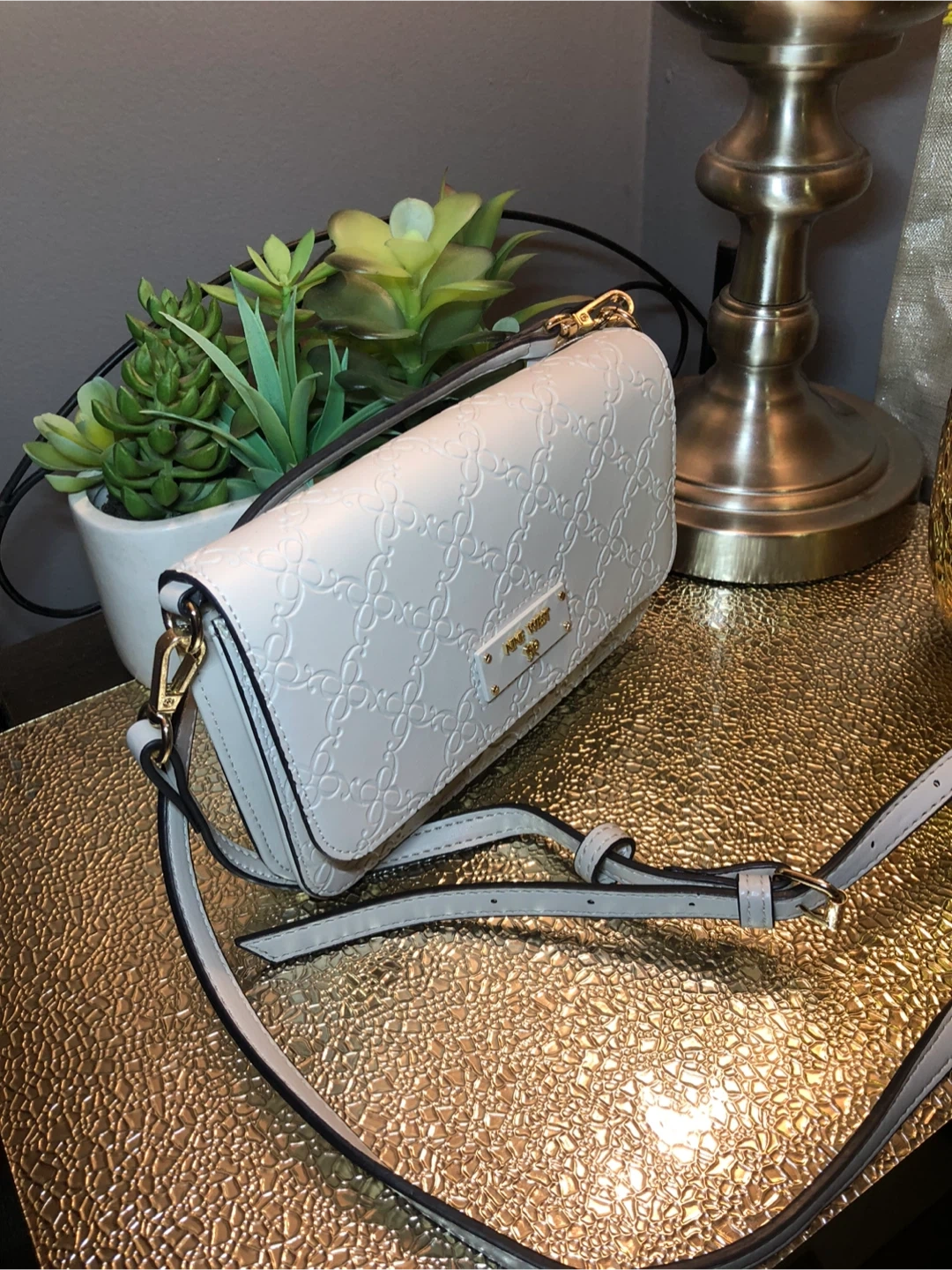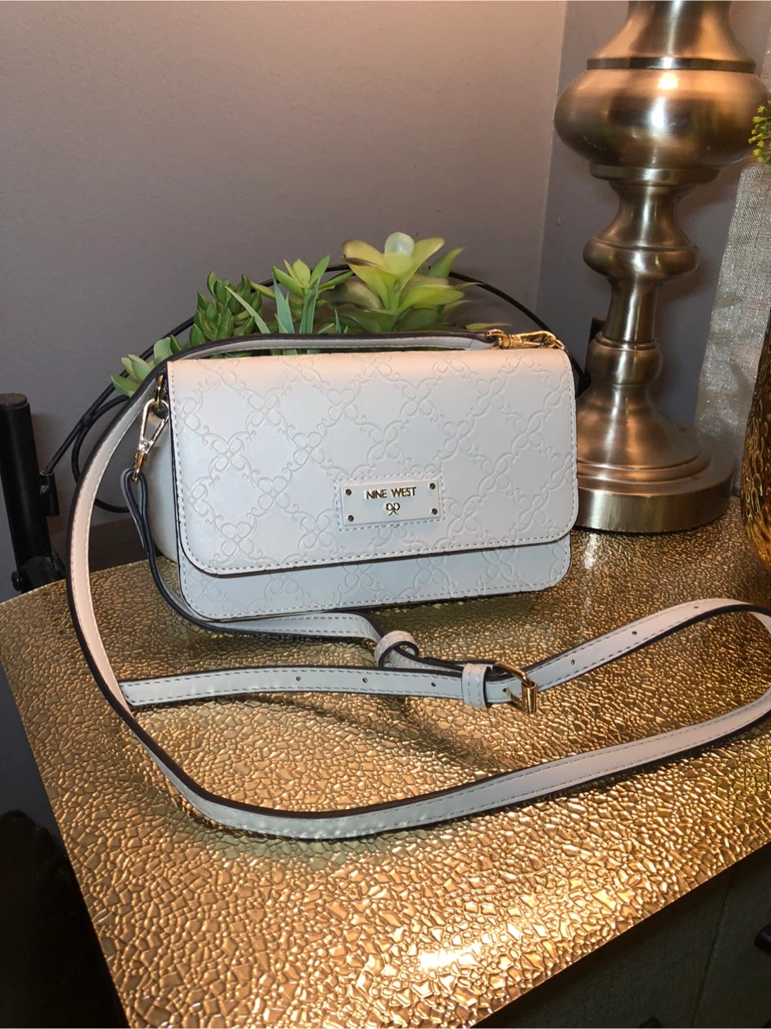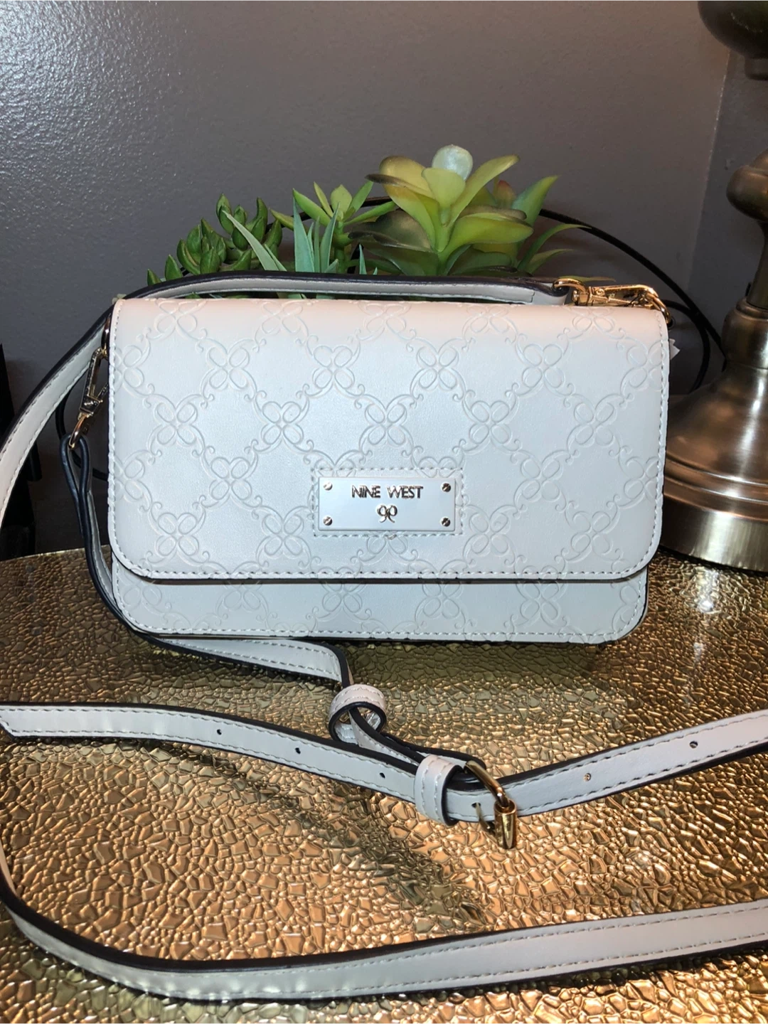 Selling a cute Nine West crossbody bag. It's in great condition and perfect for everyday use! The color is a beautiful white, and it has an adjustable strap.