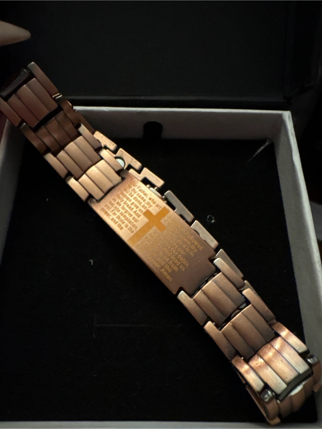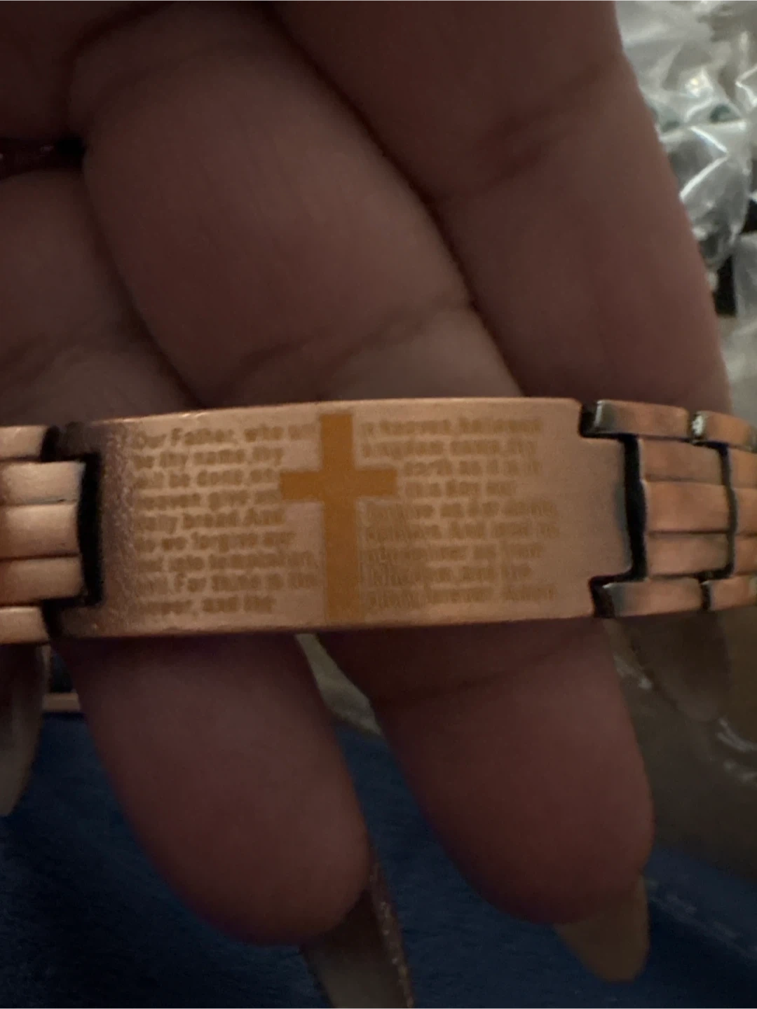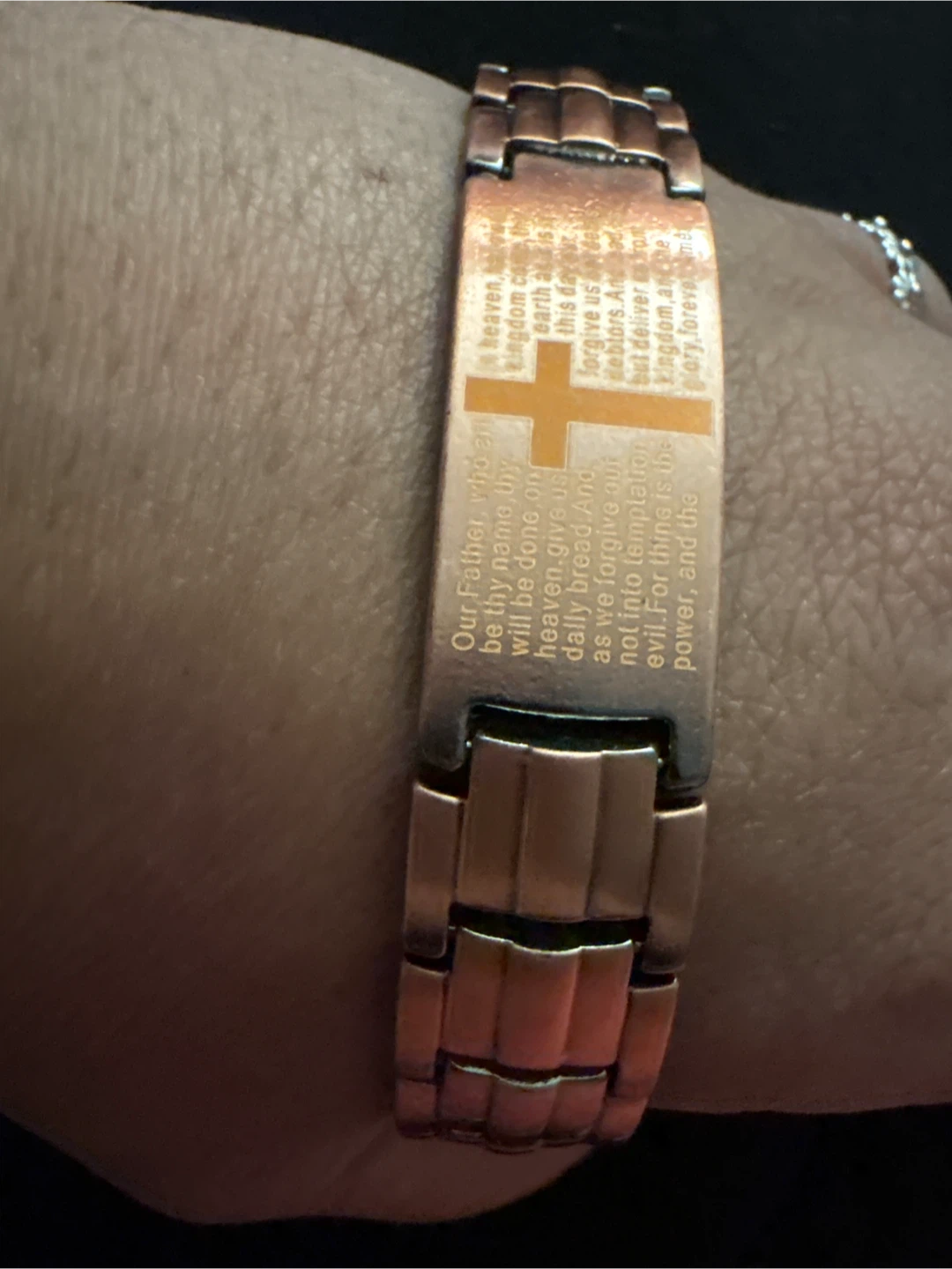 Here’s a copper bracelet with a magnetic therapy design! It has a cross and the Lord's Prayer engraved on it. It is NEW and ready for an owner!