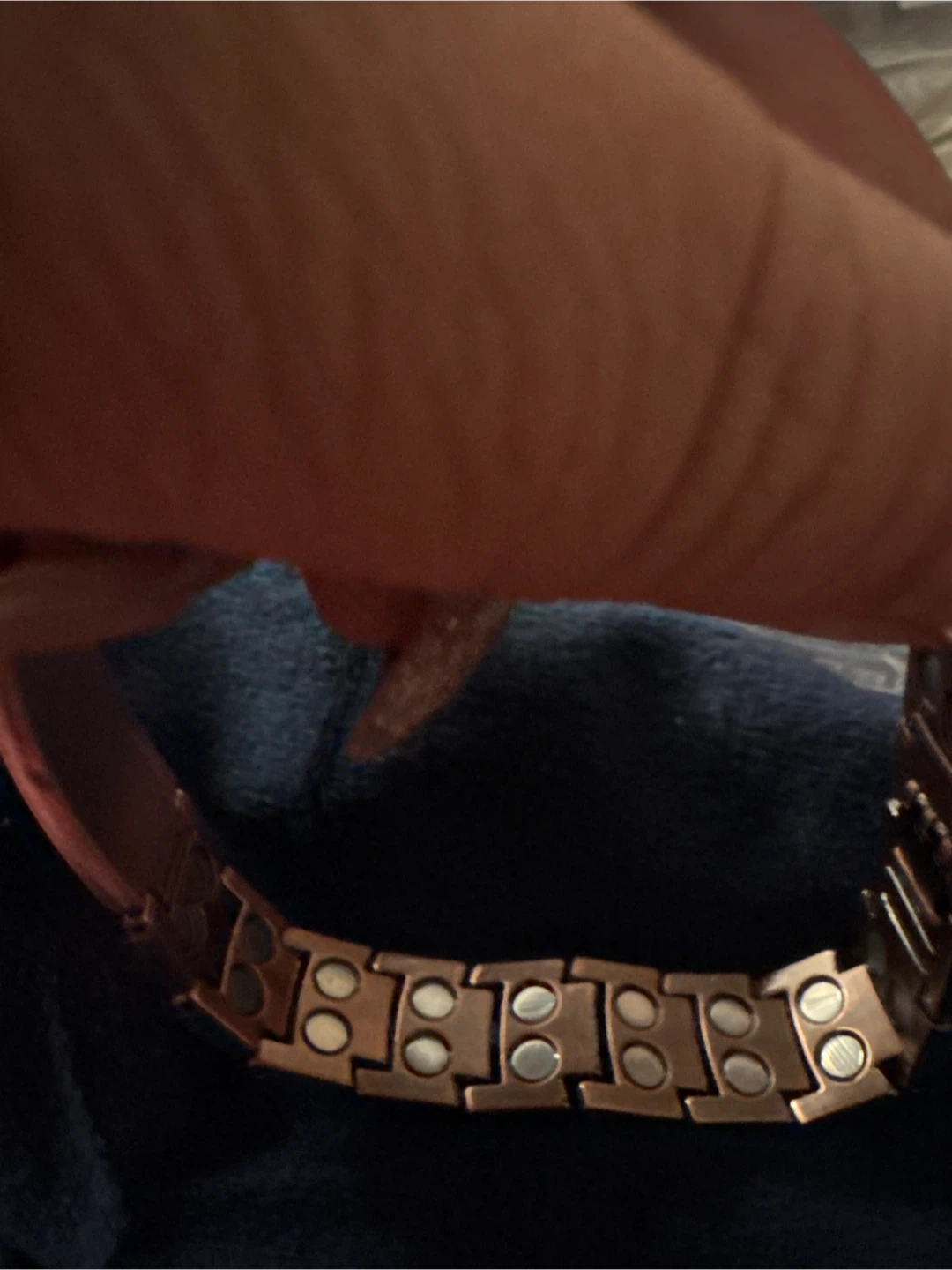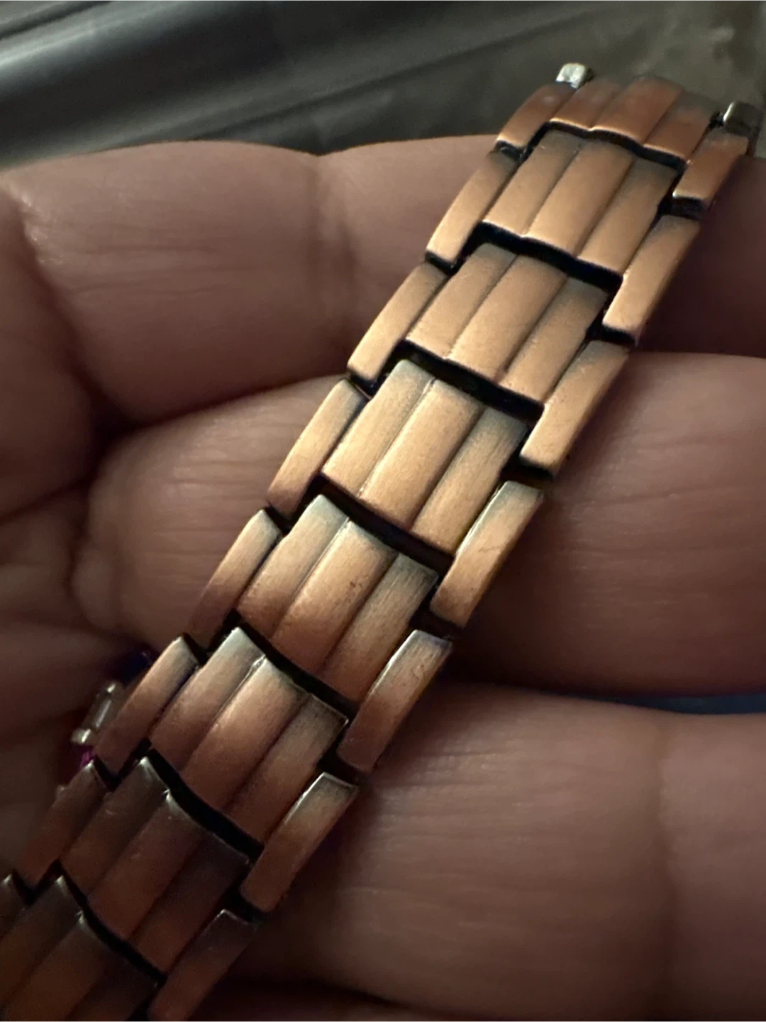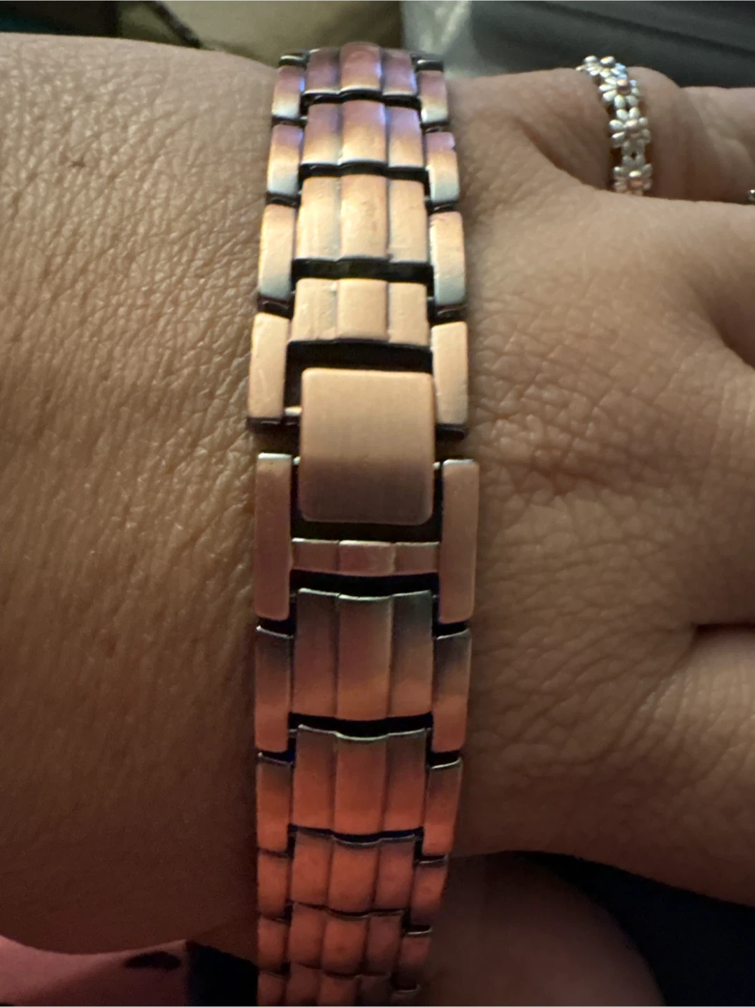 Here’s a copper bracelet with a magnetic therapy design! It has a cross and the Lord's Prayer engraved on it. It is NEW and ready for an owner!