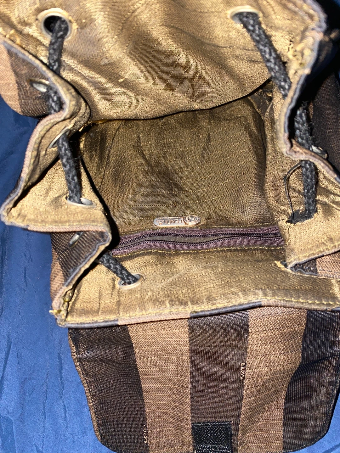 Vintage Fendi backpack with a striped design in brown and black tones. The backpack features the iconic Fendi logo and the year 1925. It shows some signs of wear but still has lots of life left!