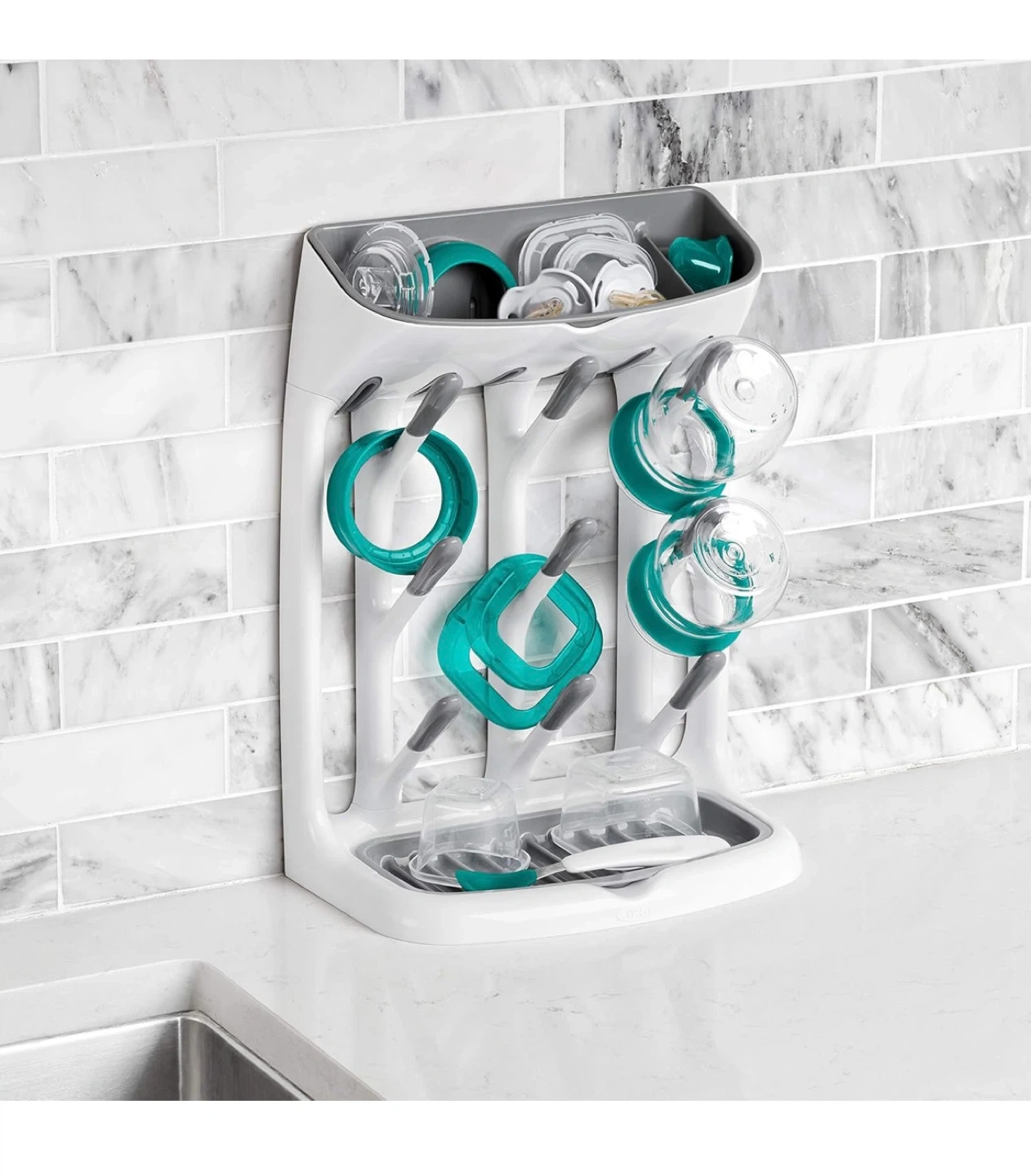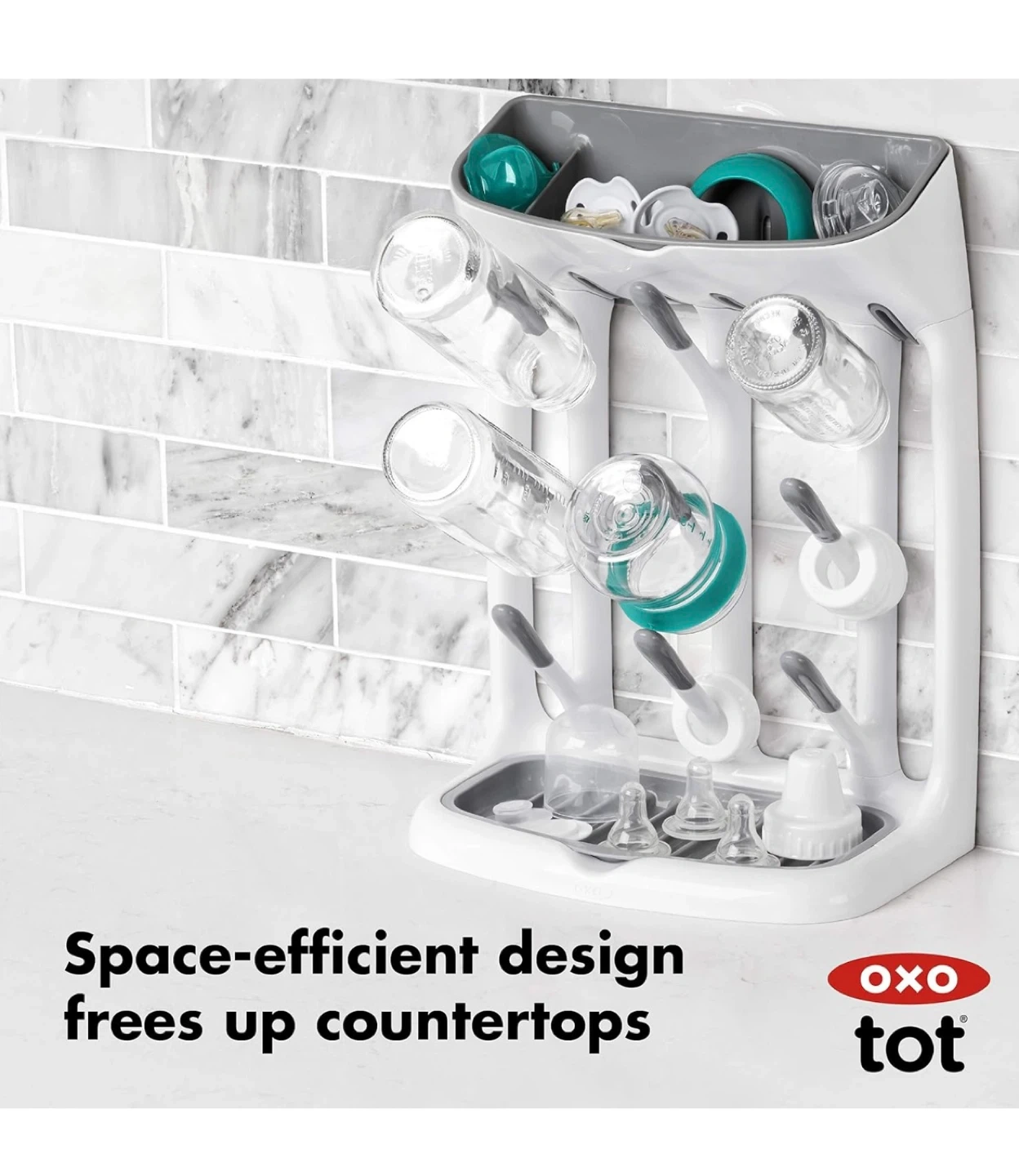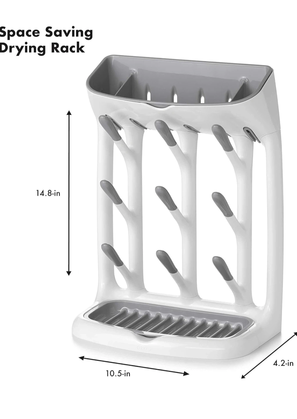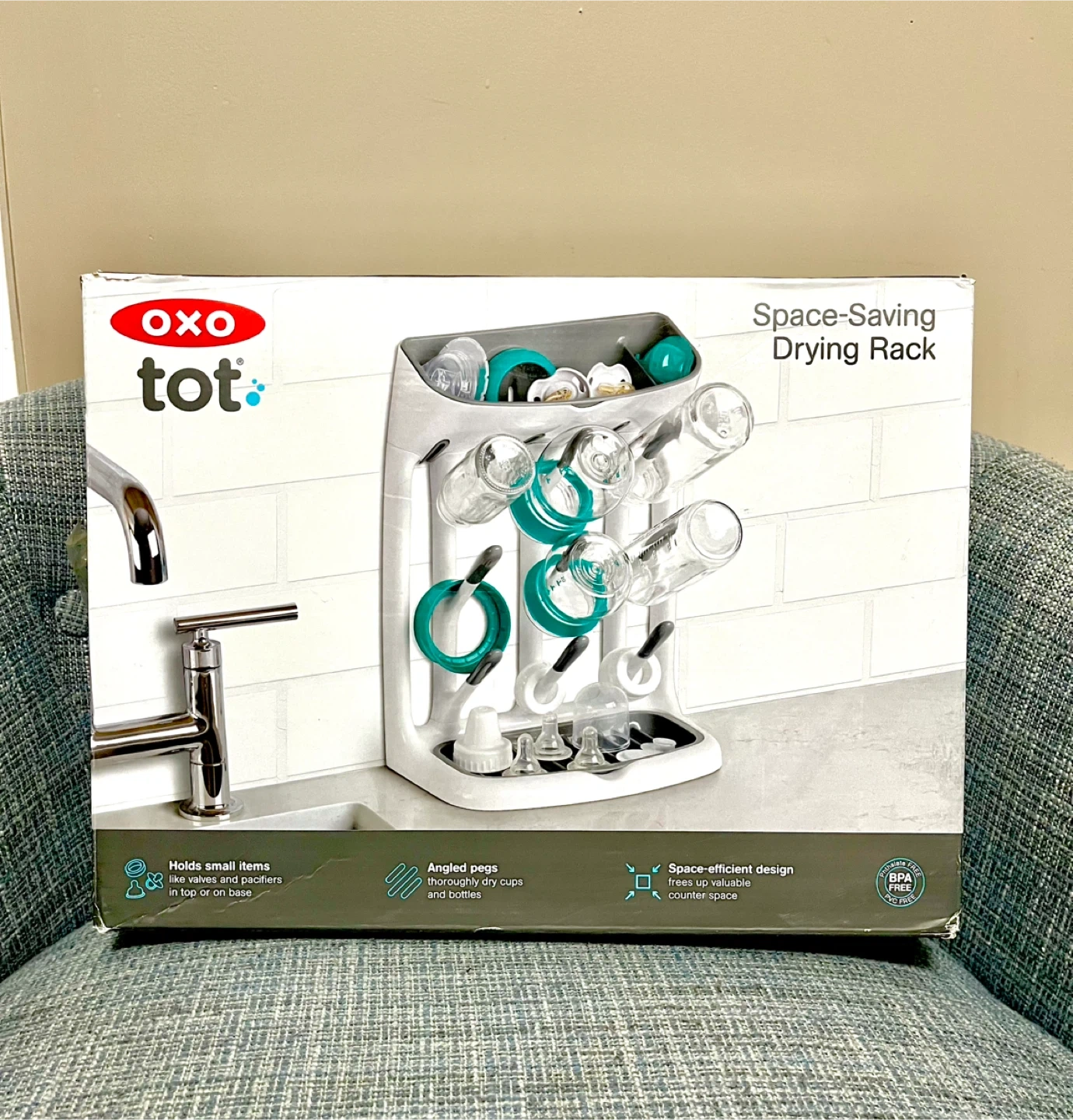 I'm selling a brand new OXO Tot Space Saving Drying Rack, still in its original packaging! This rack is perfect for keeping your baby bottles, cups, and accessories organized and dry. Its space-efficient design helps keep your counter clutter-free. It's designed to hold small items like teethers and pacifiers on top or on the base. It also has angled pegs for easy drying of cups and bottles