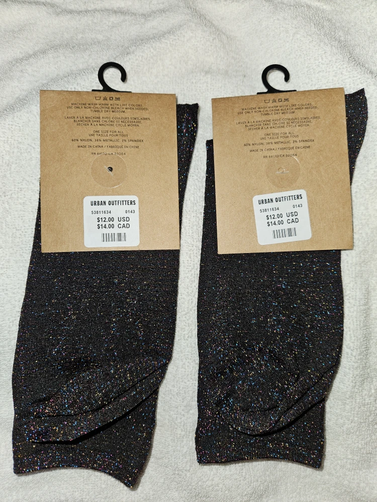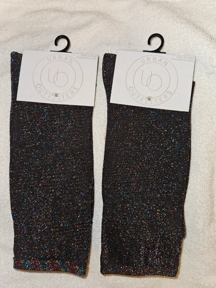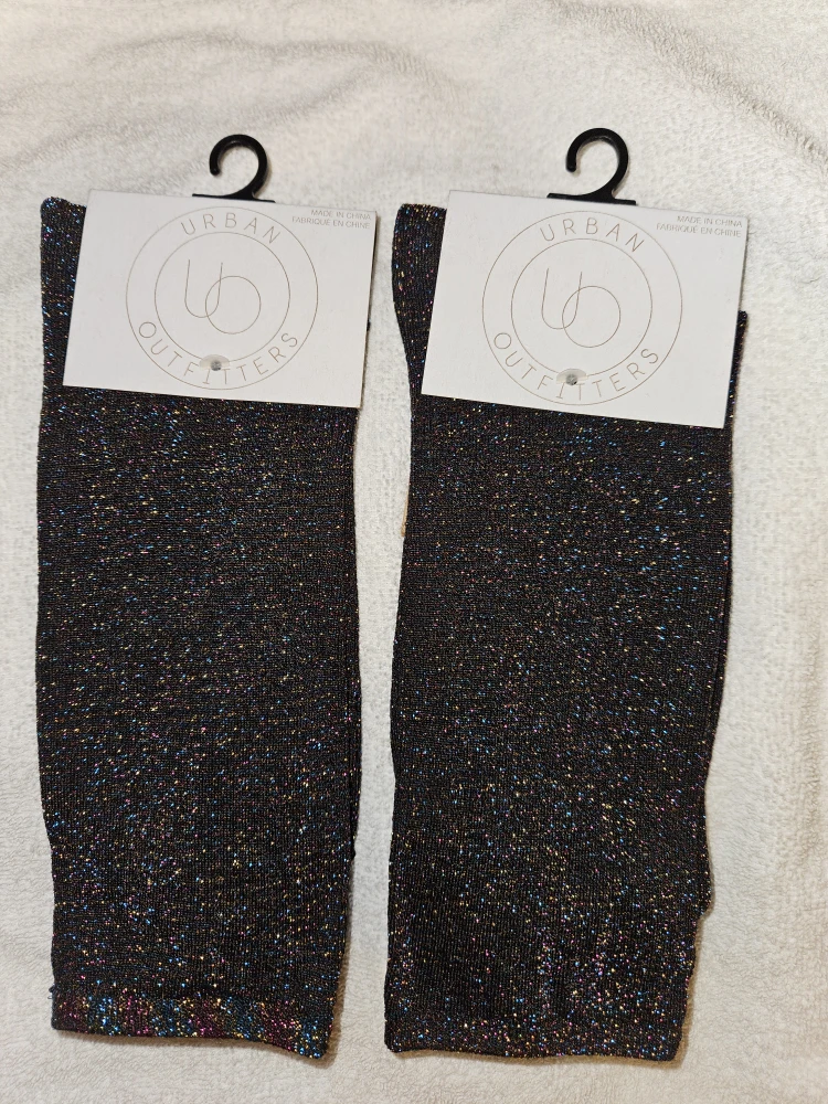 Selling a set of Urban Outfitters sparkly socks! They are one size and made of 60% nylon, 38% metallic, and 2% spandex