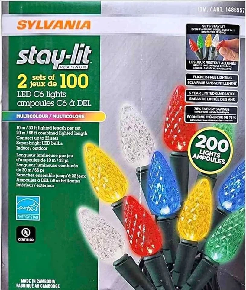 Two Sets Of Sylvania - Stay-Lit LED C6 Outdoor/Indoor String Lights, 4 x 100 Lights, Multi-Colour