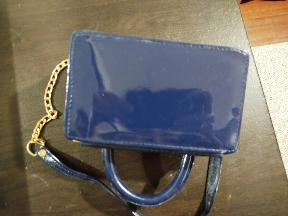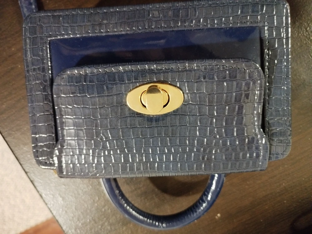This is a cute mini top handle bag in a shiny blue colour. It has a gold chain strap and a faux crocodile skin texture on the body of the bag. Perfect for a night out!