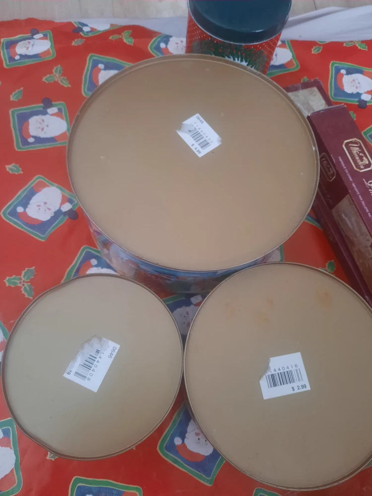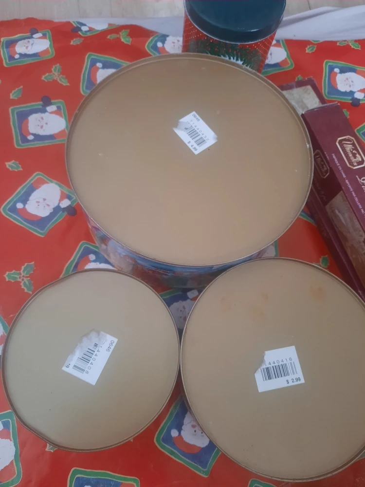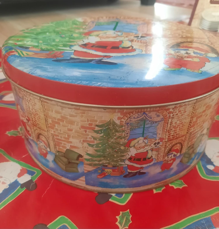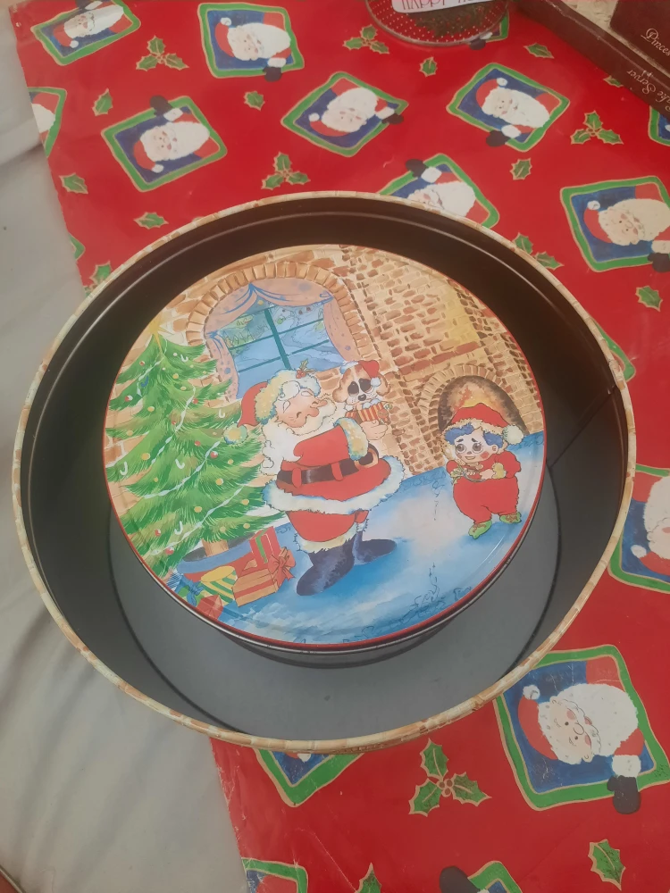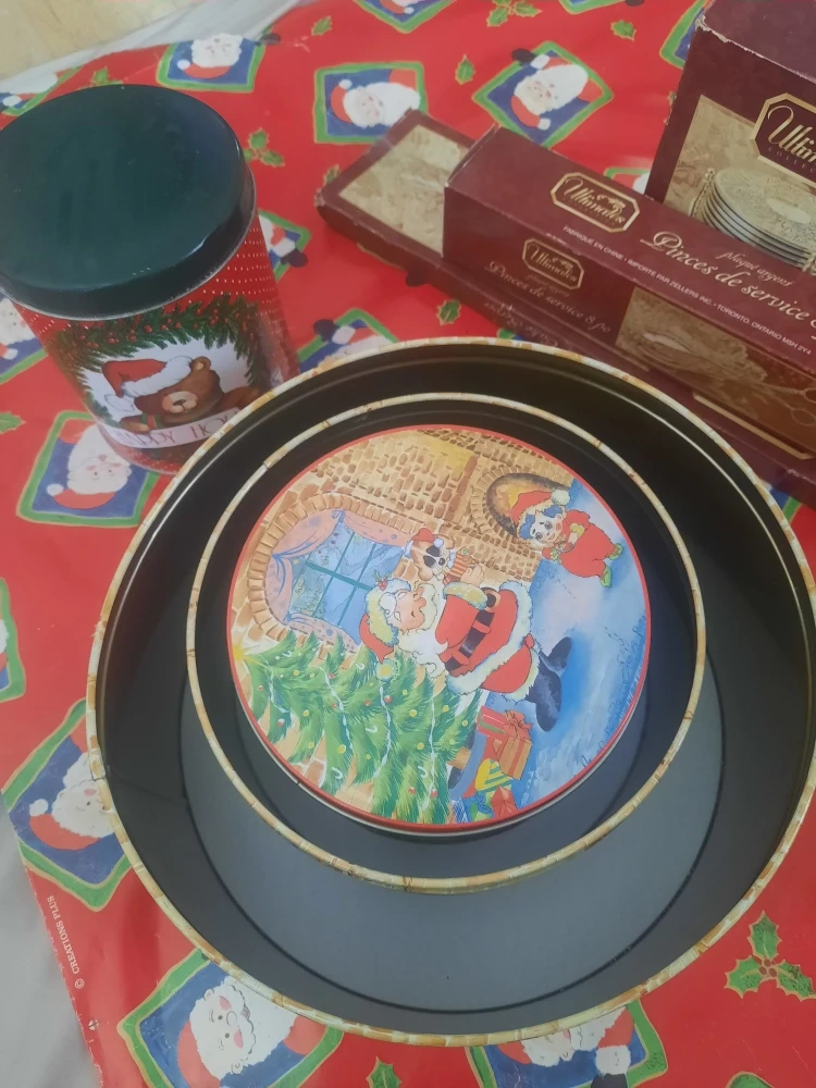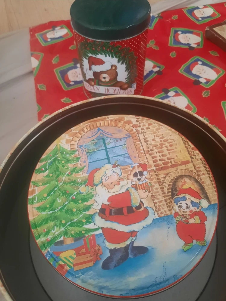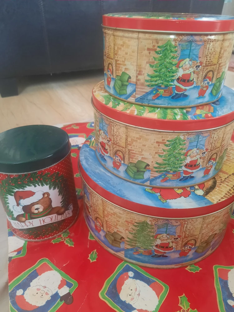 Here's a set of four vintage Christmas-themed cookie tins! They feature festive designs with Santa, Christmas trees, and other holiday scenes. Perfect for storing your holiday treats/baking/decorations or as decorative pieces during the Christmas season.