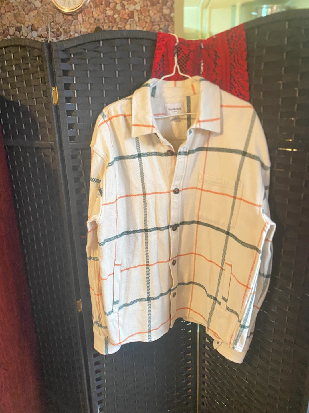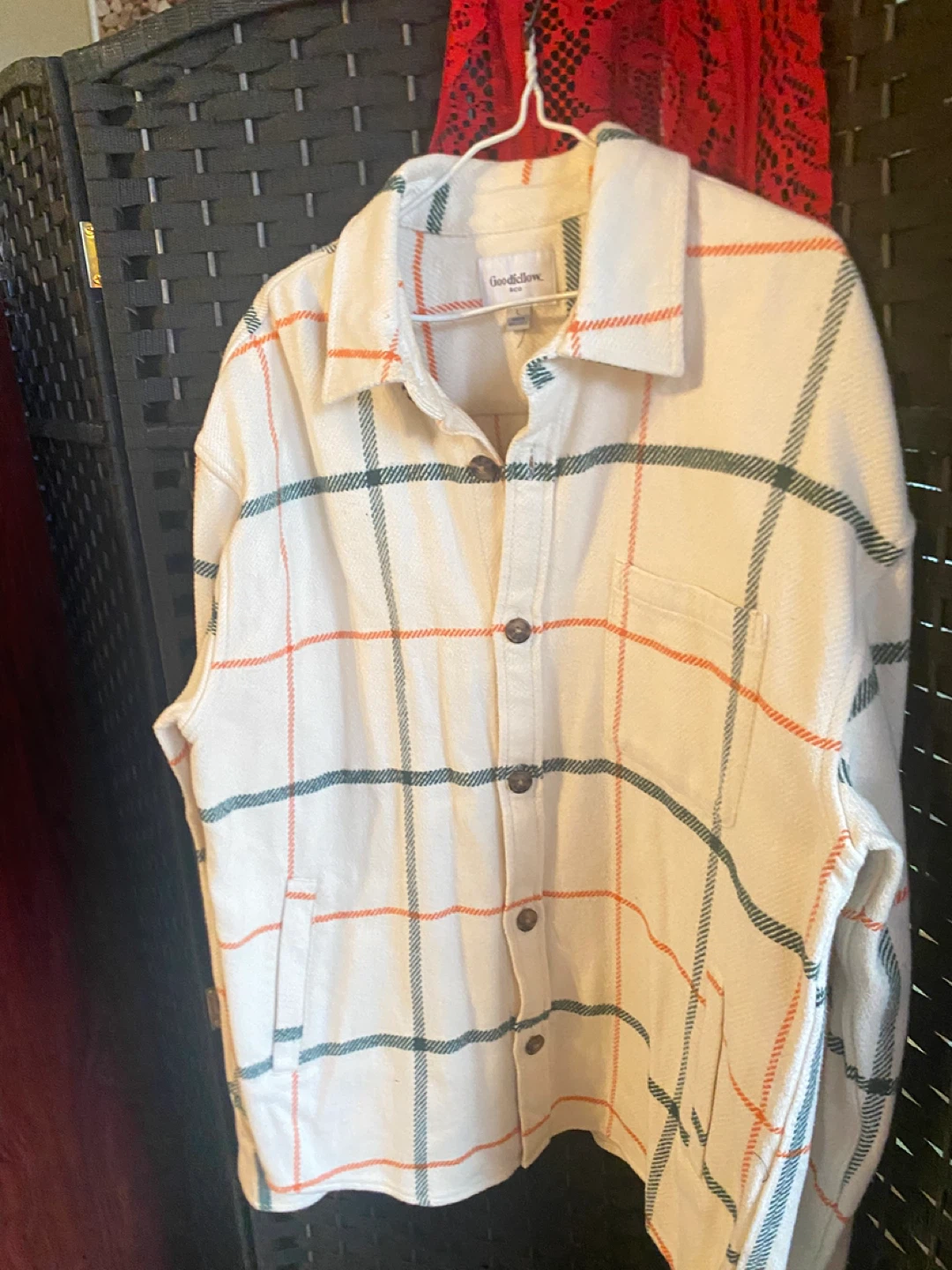 Selling a Goodfellow & Co plaid shirt jacket! It's in great condition and ready for a new owner. The jacket features a stylish plaid pattern, perfect for adding a touch of casual flair to your wardrobe. It's a versatile piece that can be worn as a shirt or a light jacket, making it ideal for layering during transitional seasons