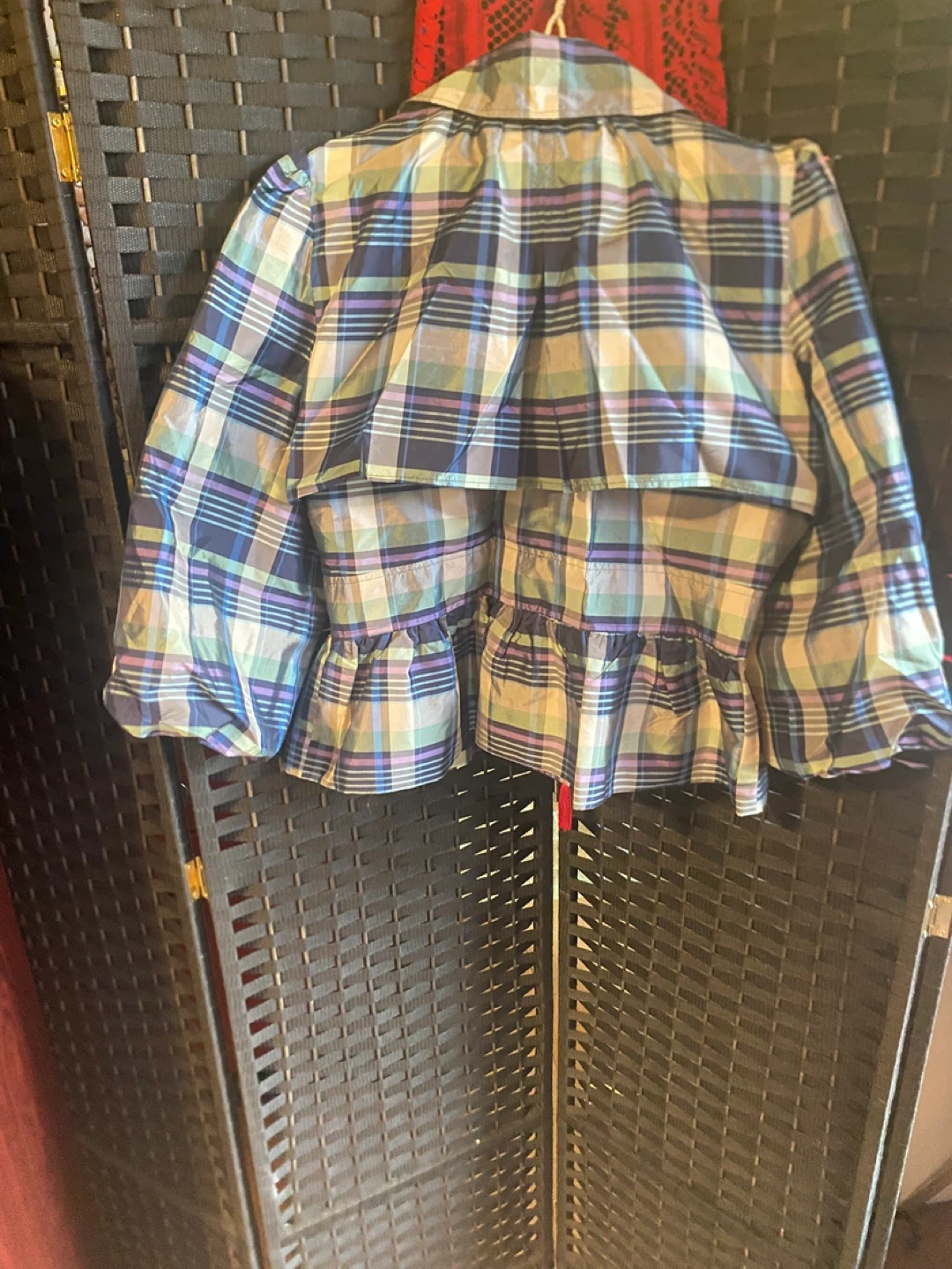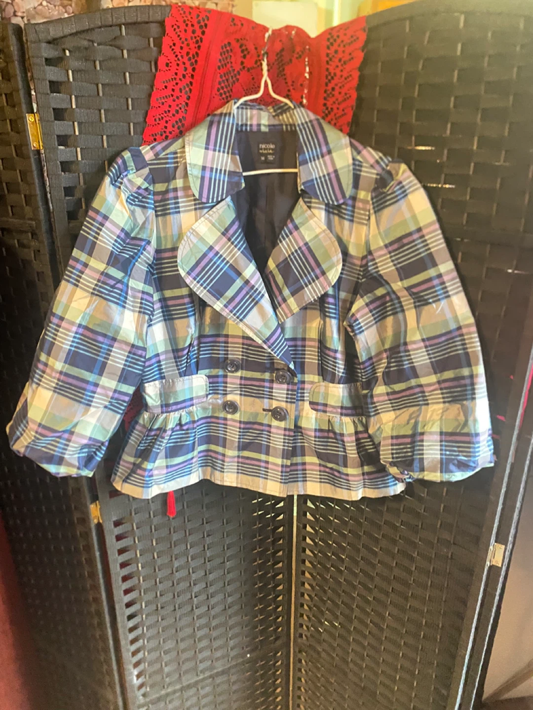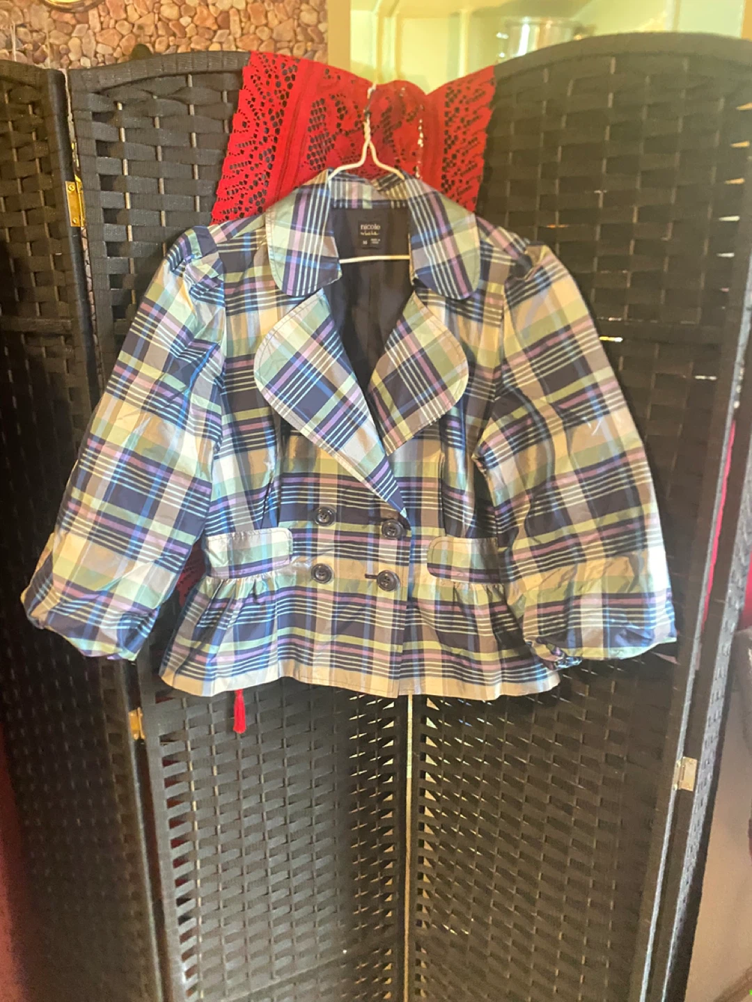 Here's a cute Nicole Studio jacket! It features a plaid design in shades of blue, green, and white. Perfect for adding a pop of color to your wardrobe
