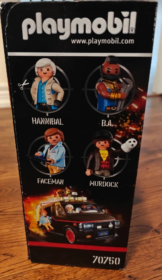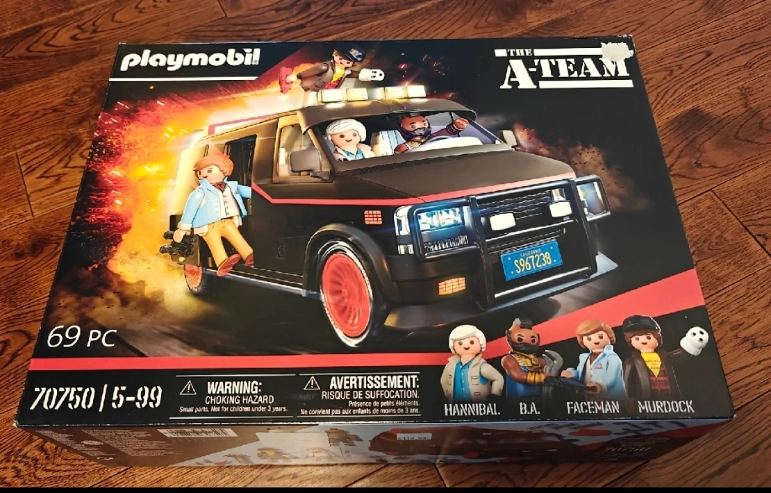 Selling a brand new, in box collectible Playmobil The A-Team Van, model number 70750! This set includes all four members of the A-Team: Hannibal, B.A., Faceman, and Murdock. It's a 69-piece set.