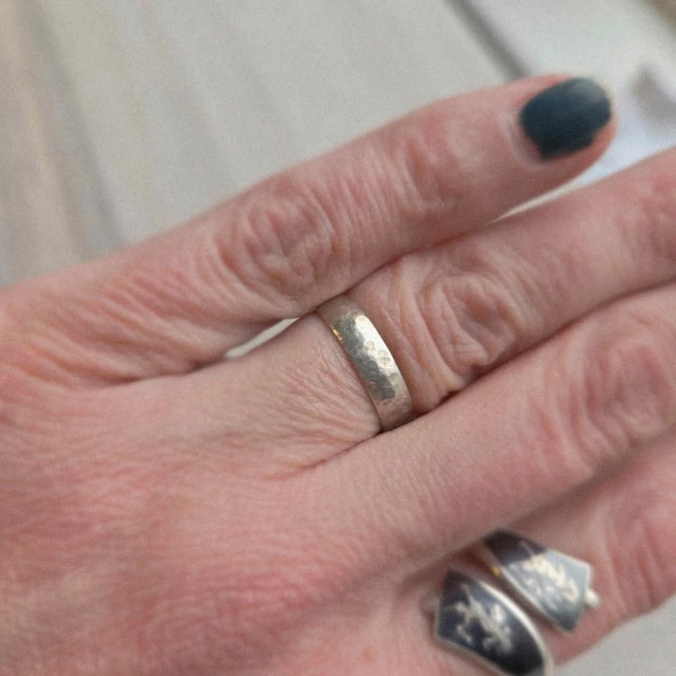 Sterling silver band ring with a light hammered texture. Size 5. Some signs of wear, visible in the photos. Great stocking stuffer! See my other adds. Lots of treasures to be found.
