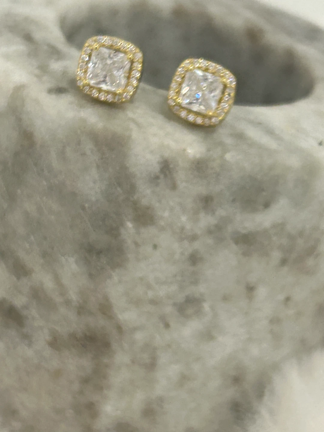 Gold Square halo Stud Earrings with crystal 925 silver and gold