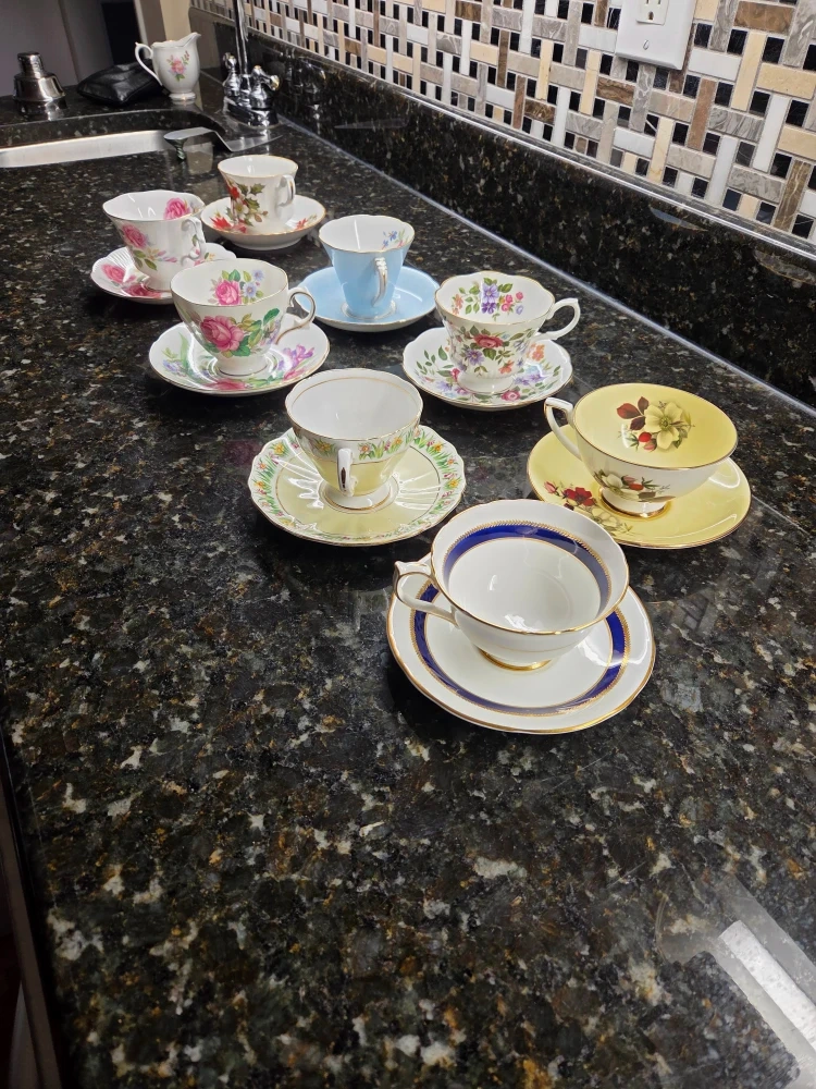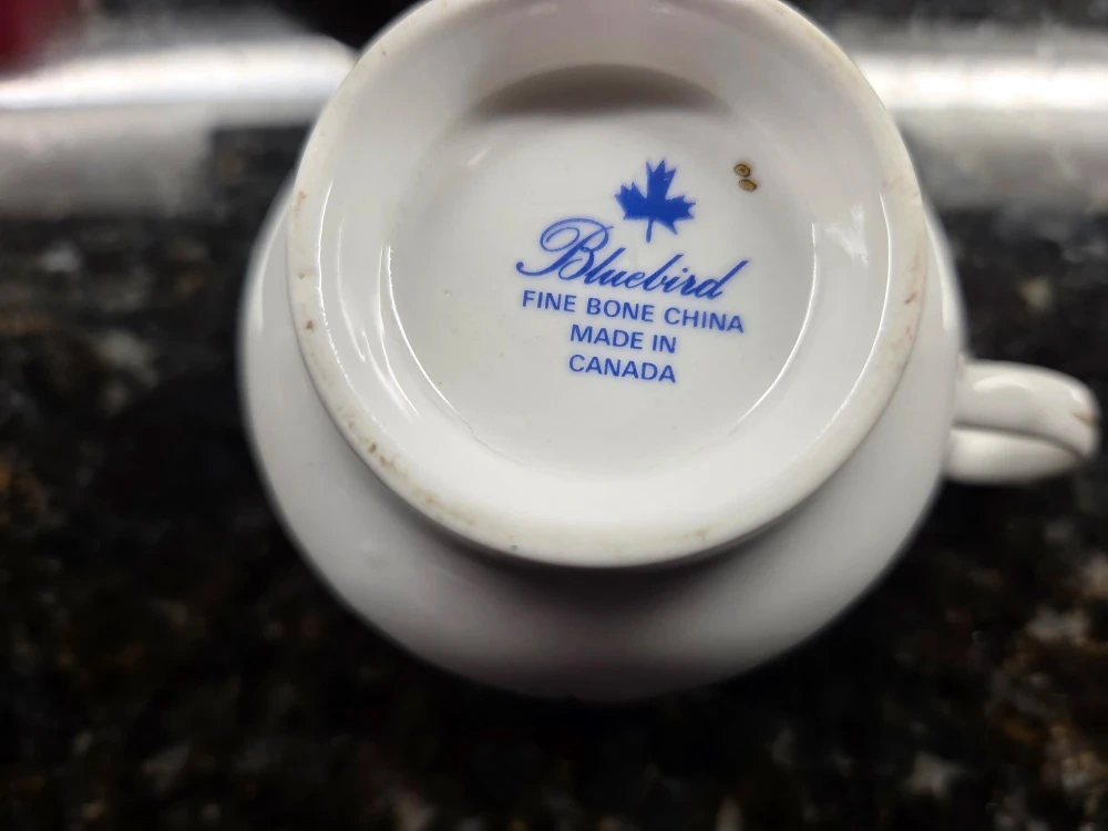 Selling a collection of 1 Bluebird Fine Bone China tea cups made in Canada and the other 6 are all made in England and saucers. Perfect for adding a touch of elegance to your tea time!