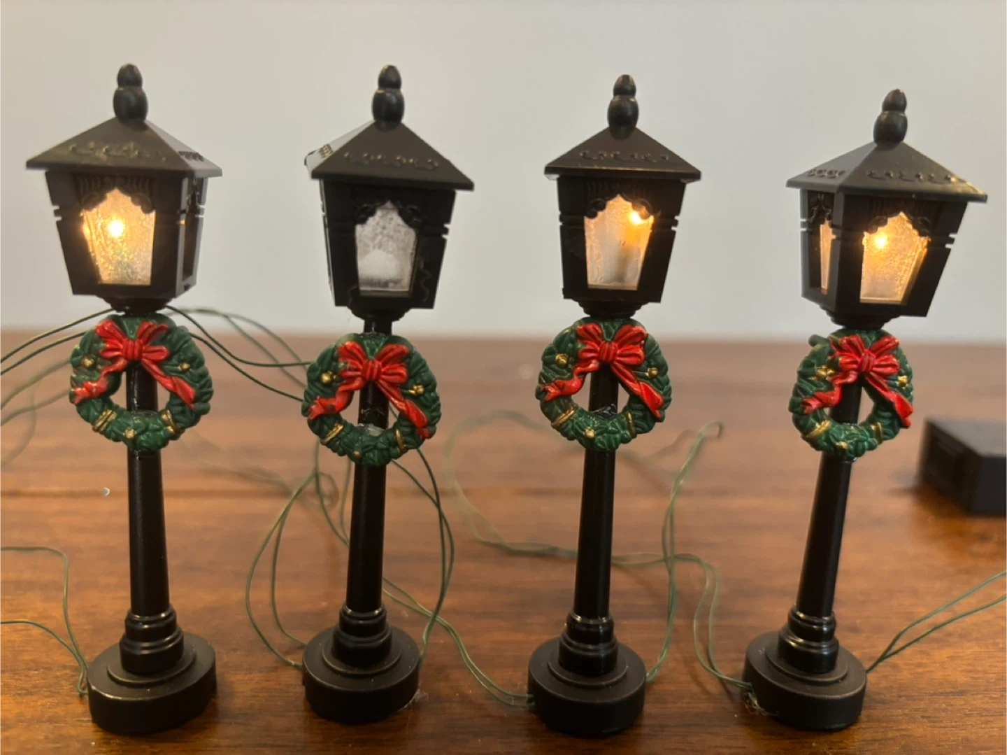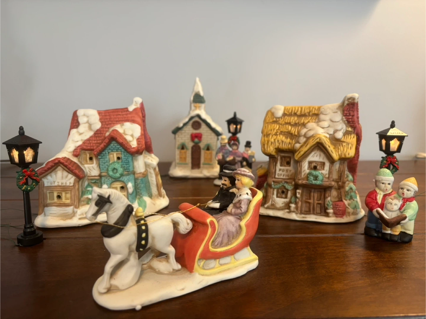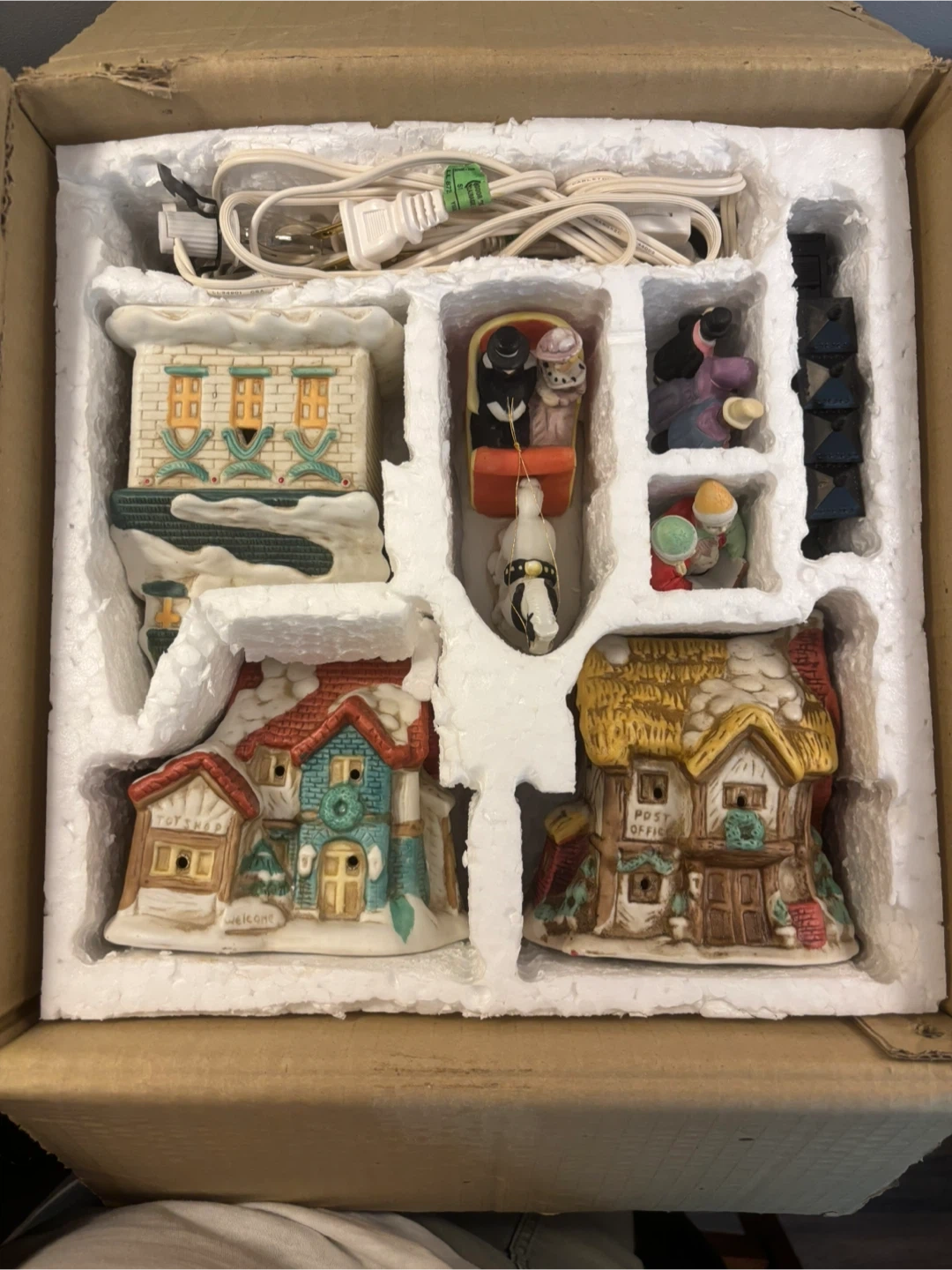 Includes a ceramic post office, home, and church with detachable bulbs (included). Three ceramic figurines: strolling villagers, carolling children, and a couple in a one horse sleigh! Also includes a set of 4 plastic 2-AA battery operated street lights (one was manufactured without a bulb, batteries not included).