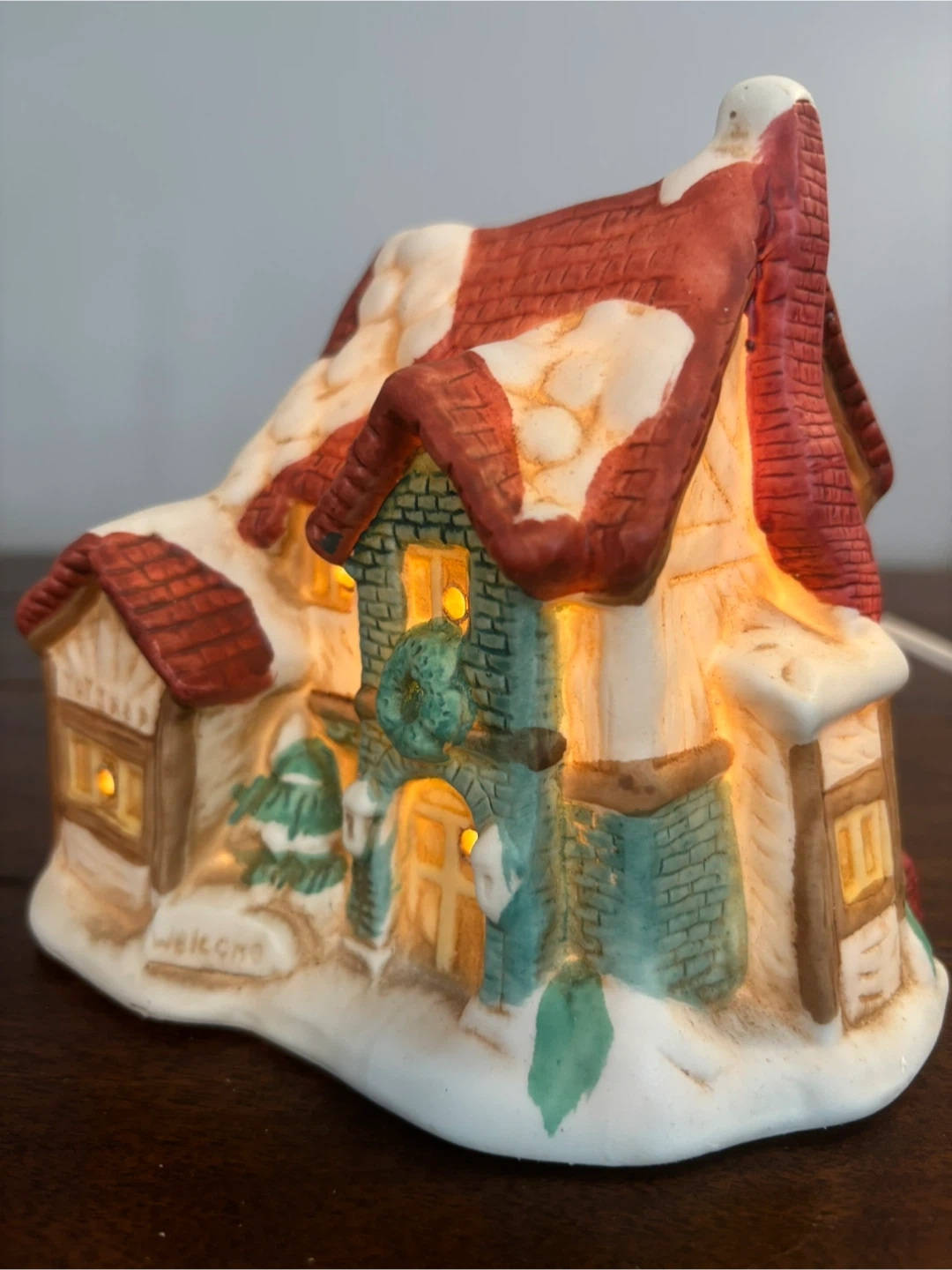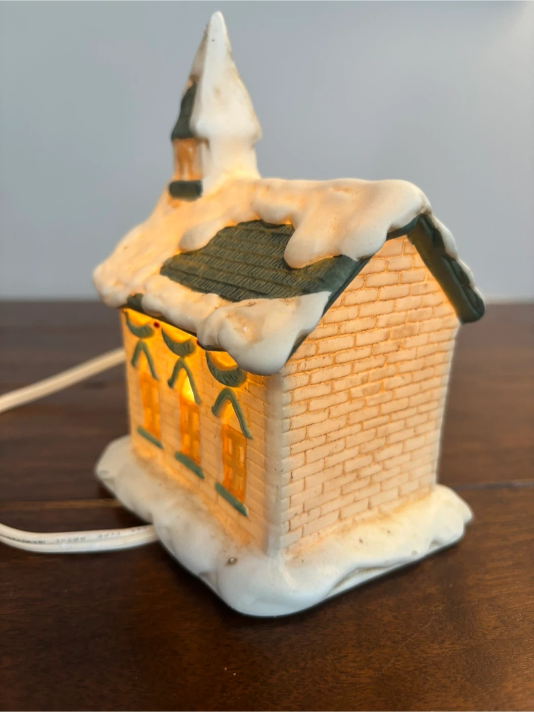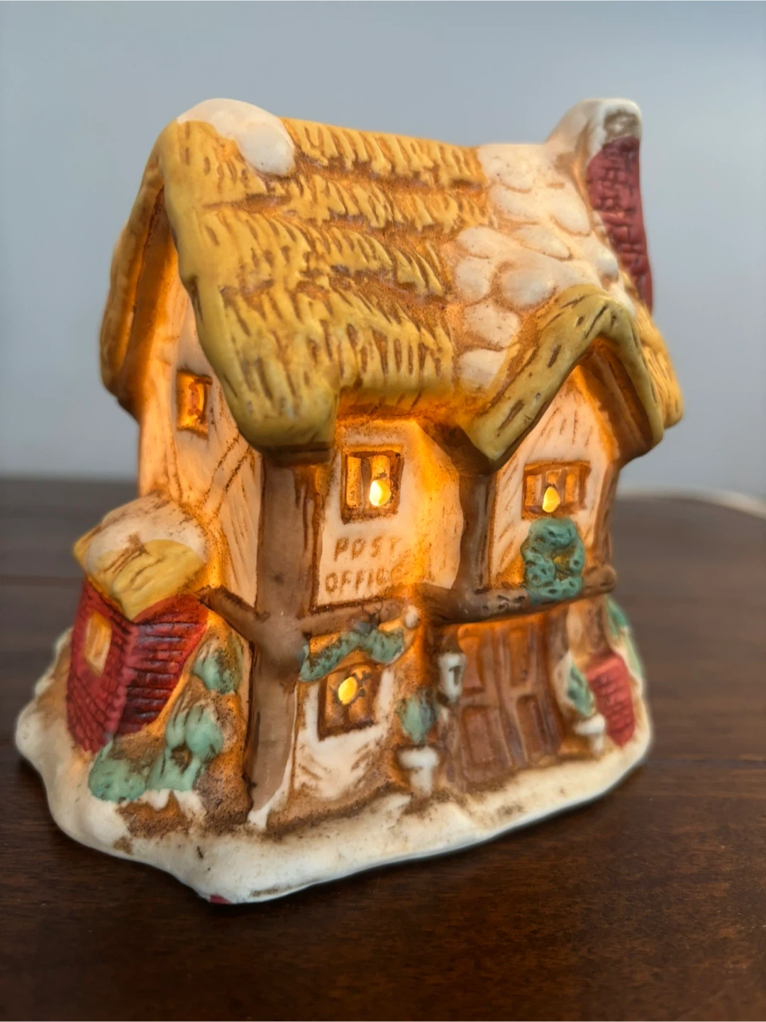 Includes a ceramic post office, home, and church with detachable bulbs (included). Three ceramic figurines: strolling villagers, carolling children, and a couple in a one horse sleigh! Also includes a set of 4 plastic 2-AA battery operated street lights (one was manufactured without a bulb, batteries not included).