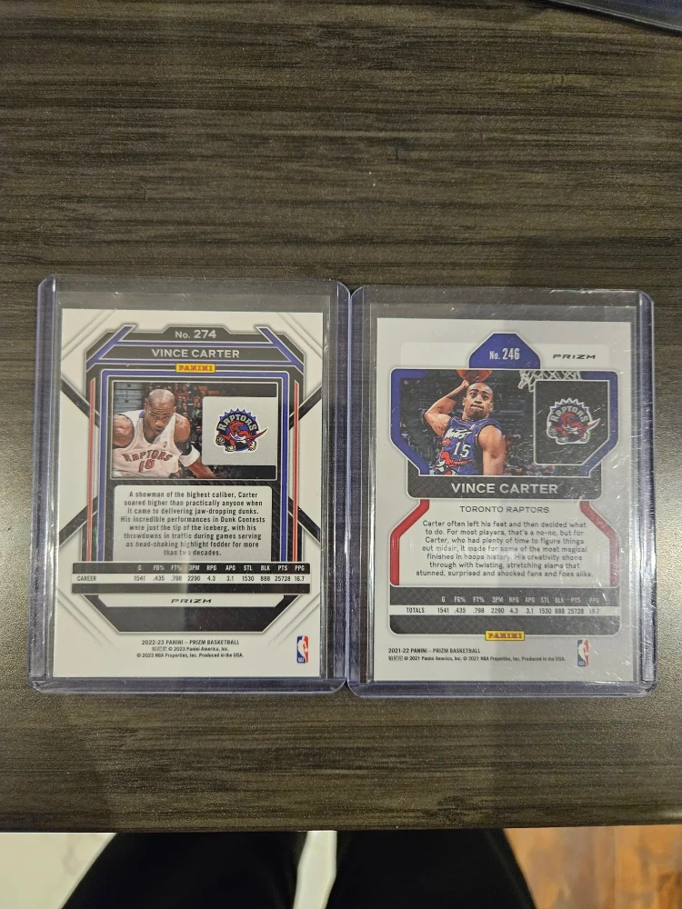 Selling two Vince Carter Prizm basketball cards. One is a green Prizm and the other is a red Prizm. Both are in great condition!