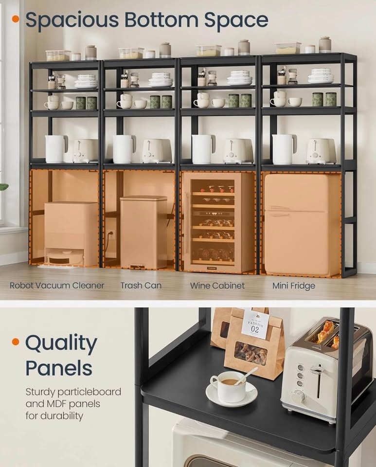 Brand new, never assembled! Perfect for coffee bars, kitchen storage, mini fridge & microwave. Adjustable shelves + built-in power outlet. Stylish Ink Black design.