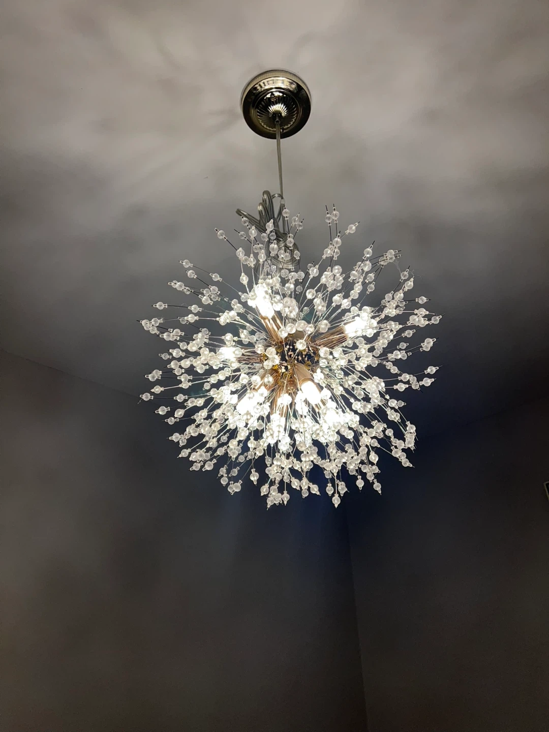 Add a touch of sparkle to your home with this beautiful crystal burst chandelier! It's a real statement piece that catches the light beautifully. Perfect for a dining room or living room, this chandelier will definitely impress your guests