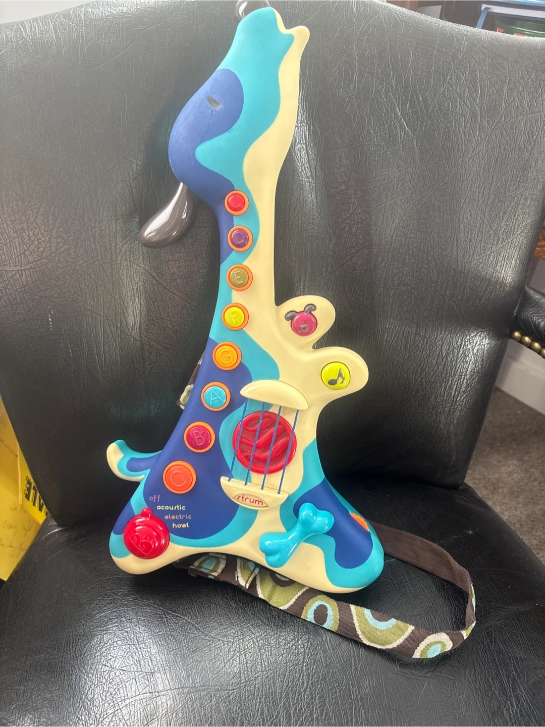 Selling a B. Toys Woofer Guitar, a fun musical toy for kids! It features different sound modes like acoustic, electric, and howl. It's in great condition and ready for a new little musician