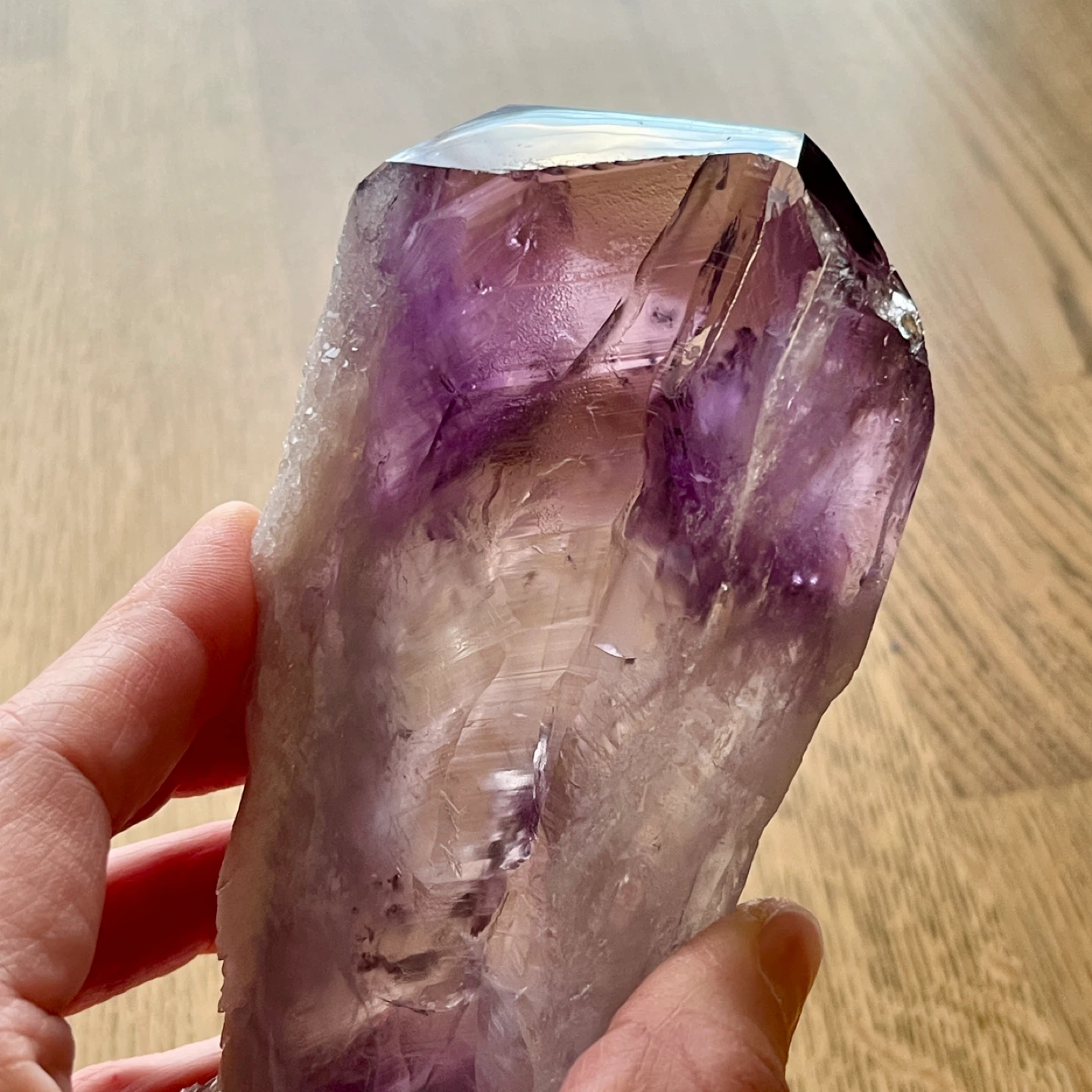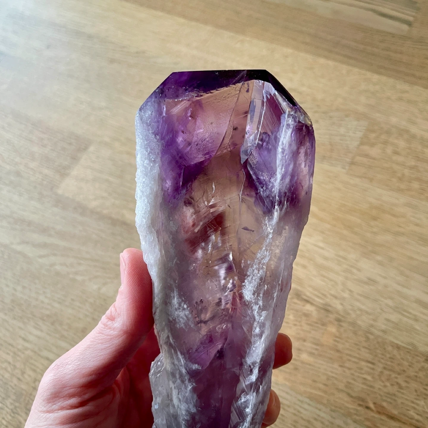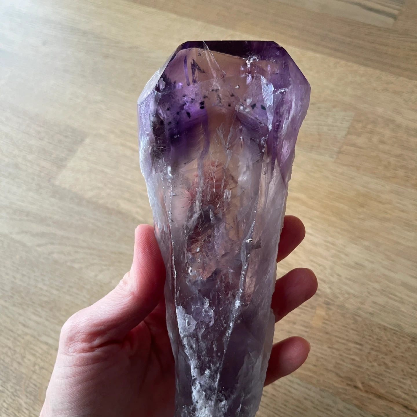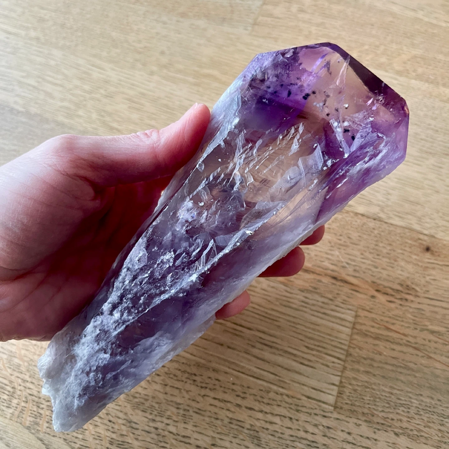 An amethyst scepter, or "torch" crystal, is a unique formation where a larger amethyst grows atop a smaller one, amplifying the stone's natural healing and protective energies for focused spiritual work, meditation, and channeling higher consciousness.