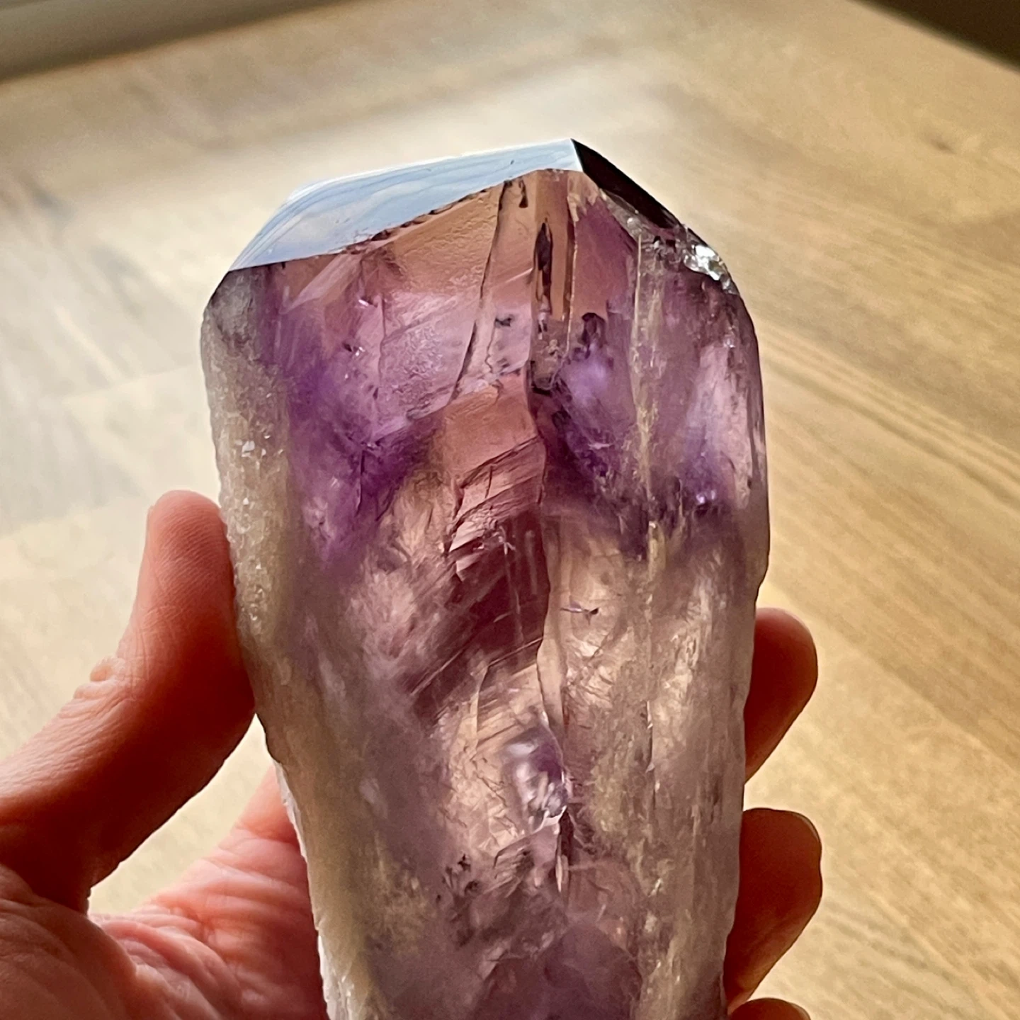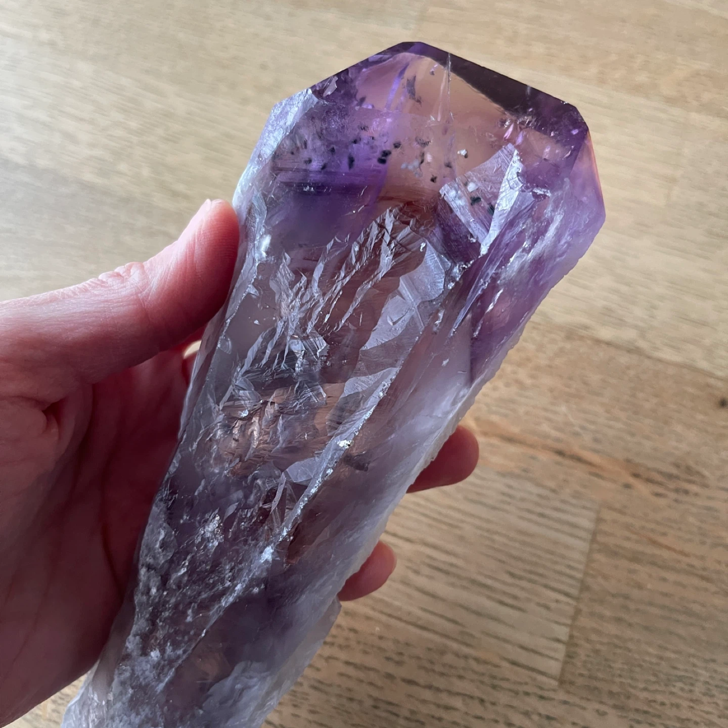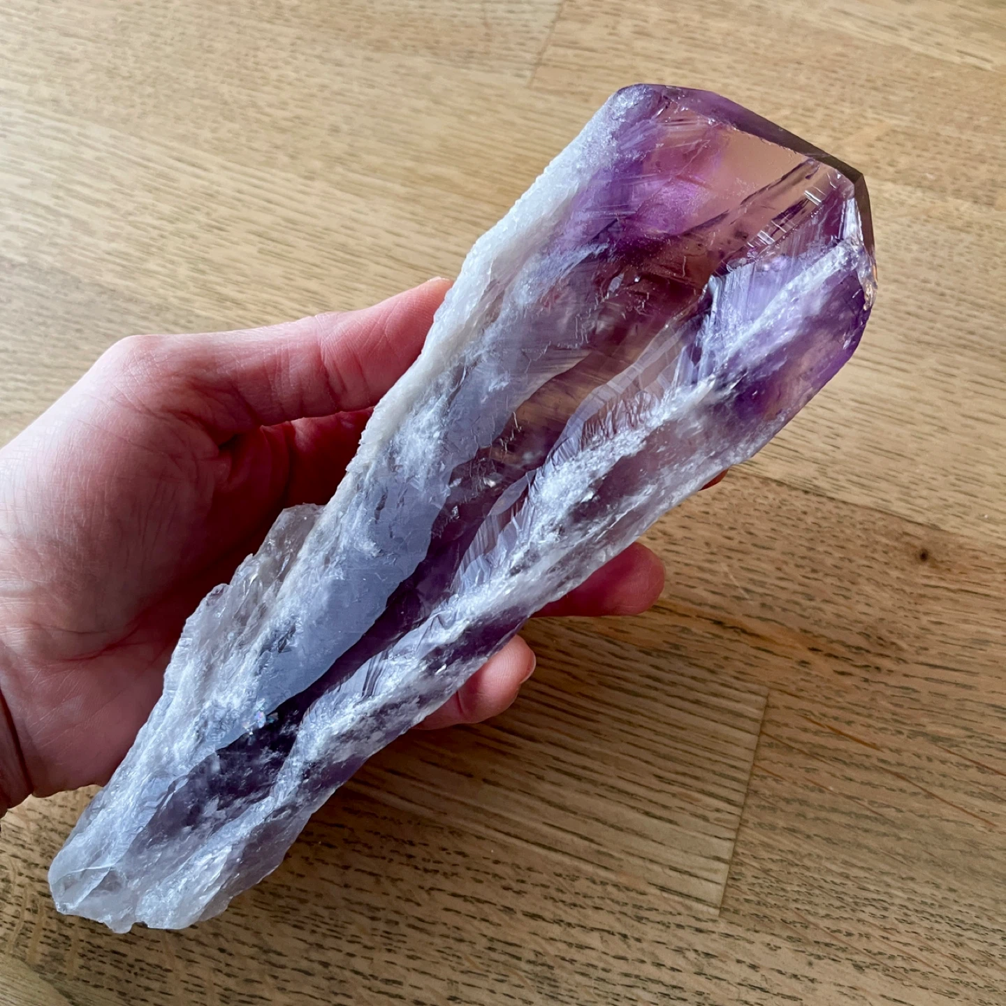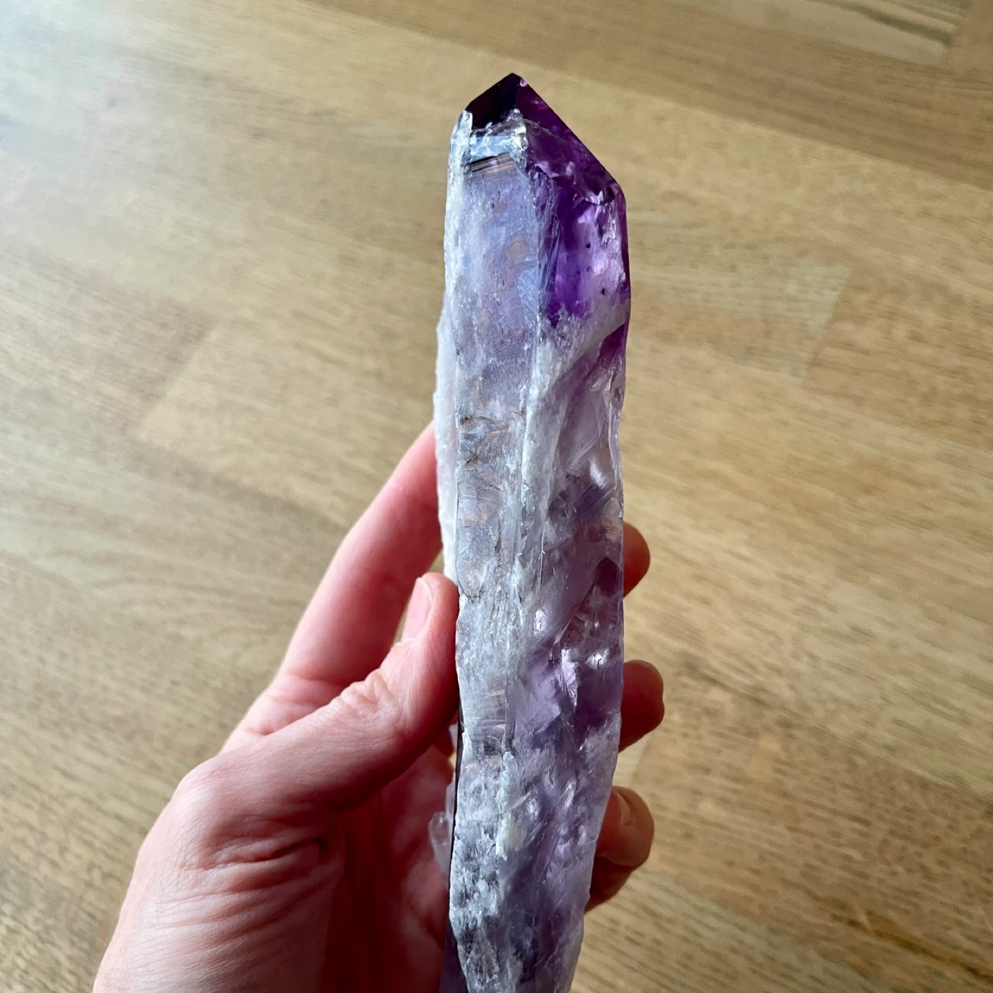 An amethyst scepter, or "torch" crystal, is a unique formation where a larger amethyst grows atop a smaller one, amplifying the stone's natural healing and protective energies for focused spiritual work, meditation, and channeling higher consciousness.