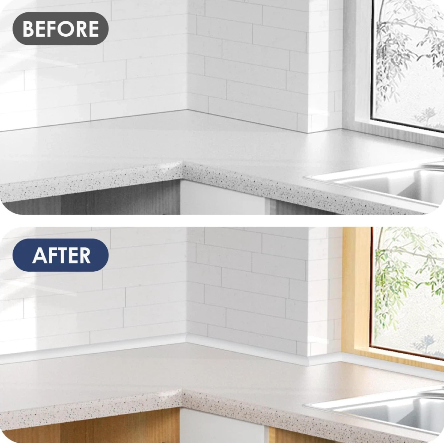 A roll of 158” Pattengo flexible round molding! It's white, easy to clean and cut, soft, self adhesive, flexible, and water resistant.