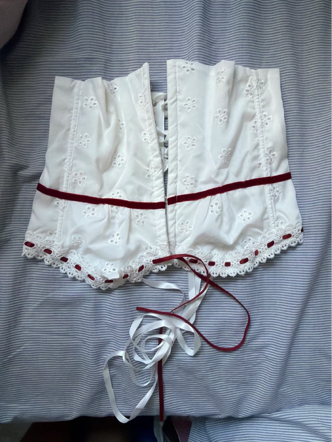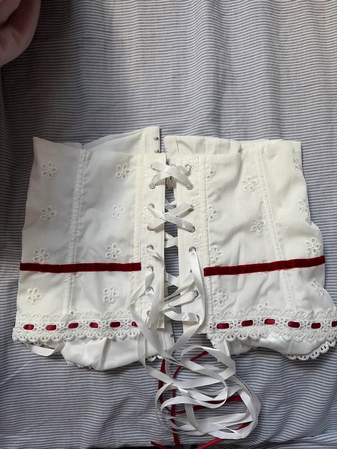 Selling a cute white corset top with red ribbon detailing. It's in great condition and would look great with a variety of outfits! The corset has a lace-up front and a delicate floral pattern.