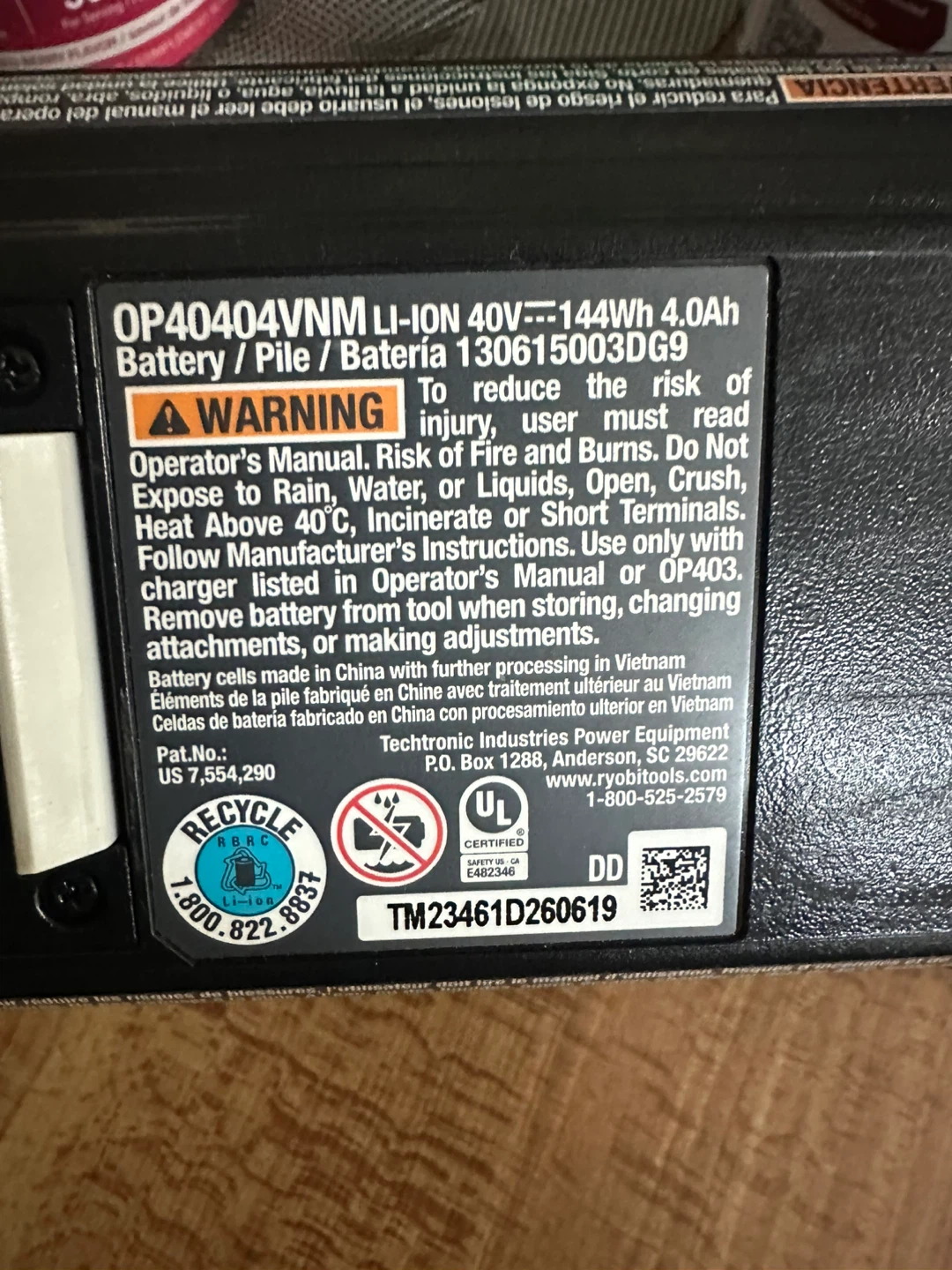 Selling a Ryobi 40V lithium battery. It's a 4.0Ah battery with the model number OP40404VNM. It is compatible with Ryobi 40V tools.