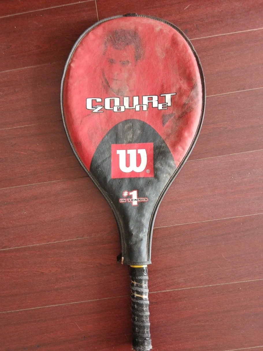 Wilson Court Zone tennis racquet. It's in used condition with some wear and tear, but still has some life left in it!