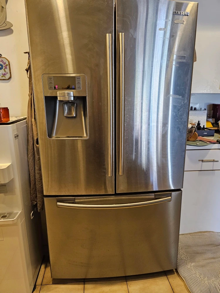 Selling a Samsung stainless steel refrigerator. It has a water and ice dispenser. There are some signs of use.