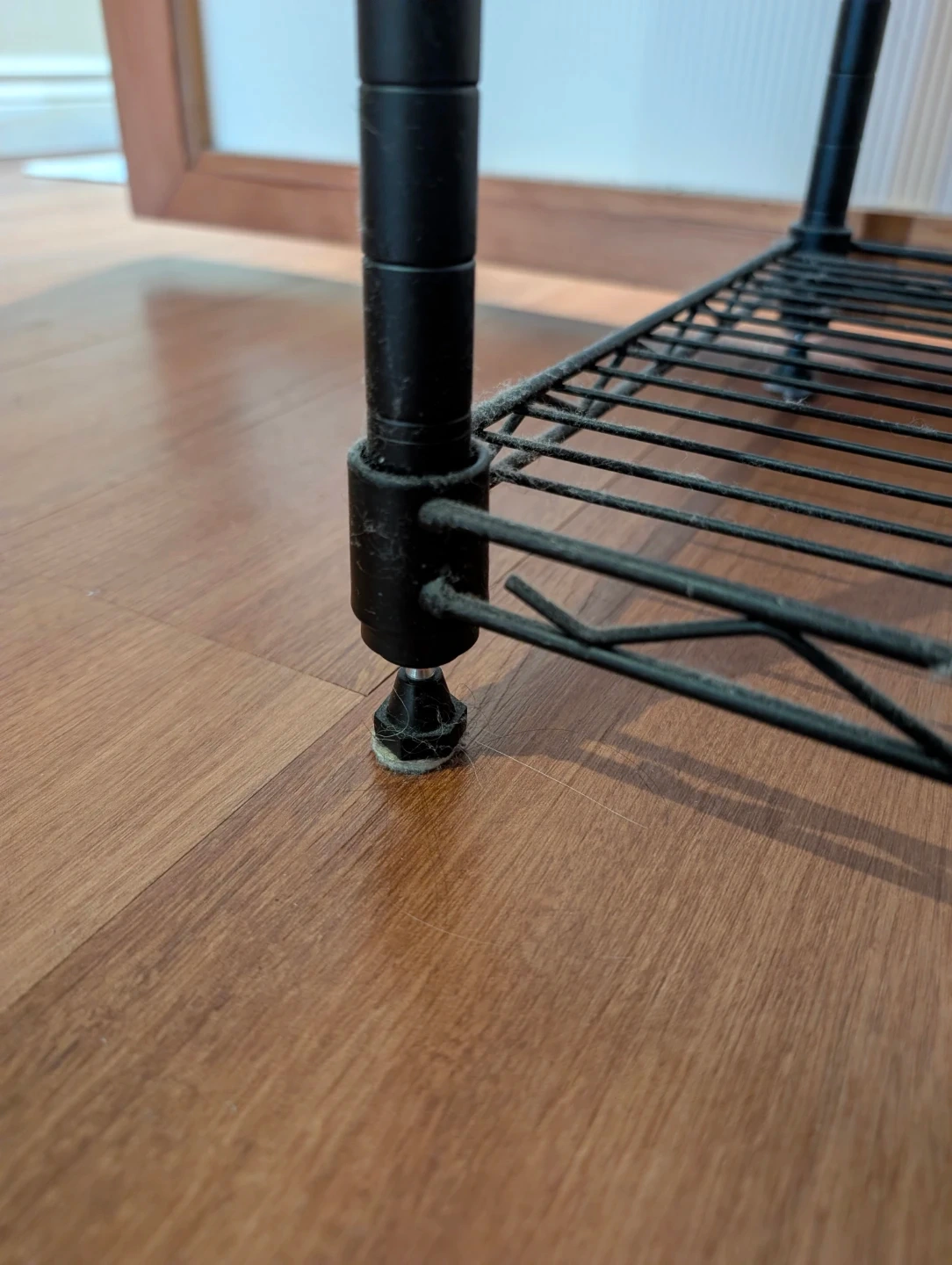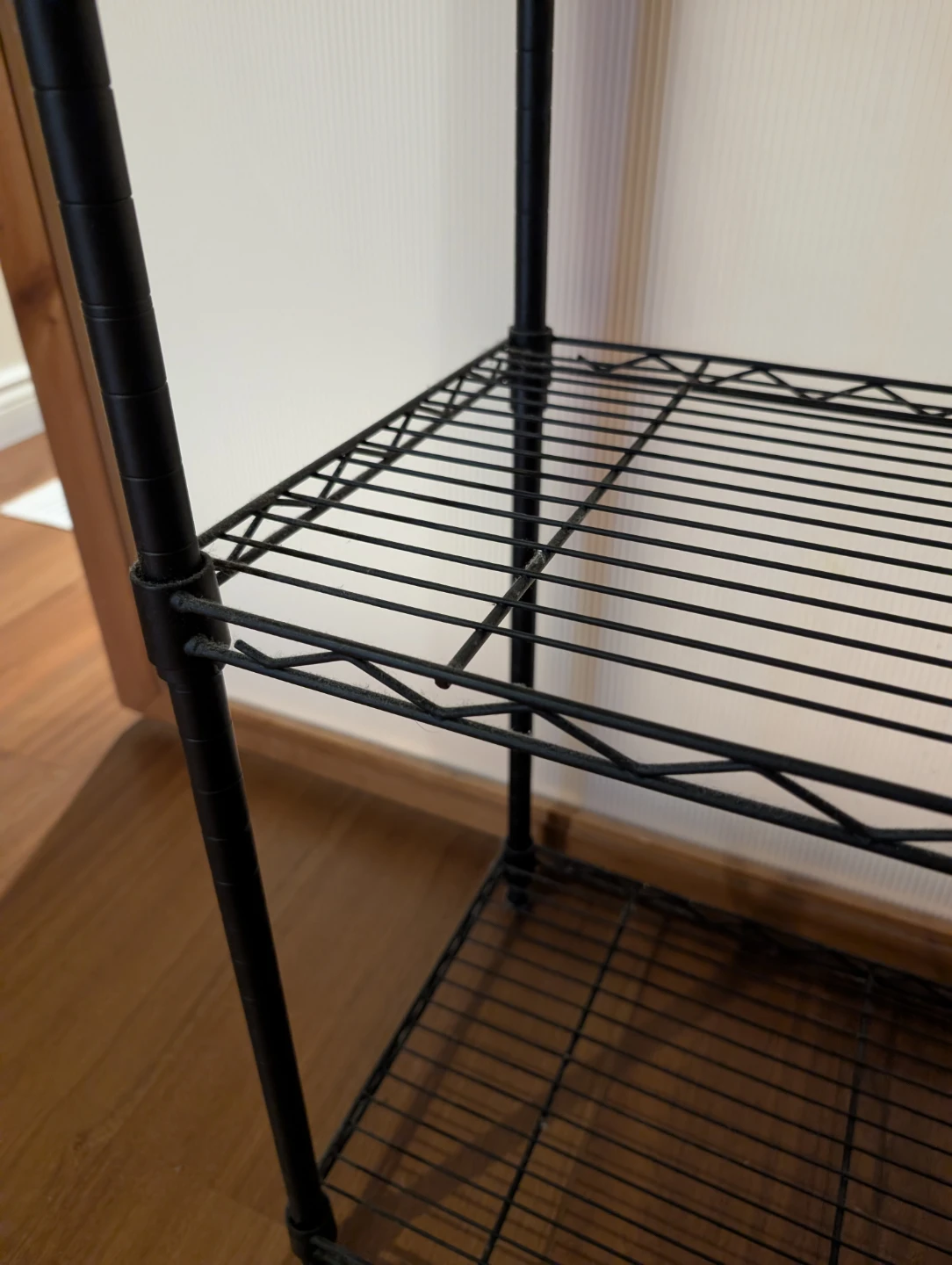 3-tier wire shelf. Coated wire, black. Adjustable feet for leveling. Good condition, a little dusty.