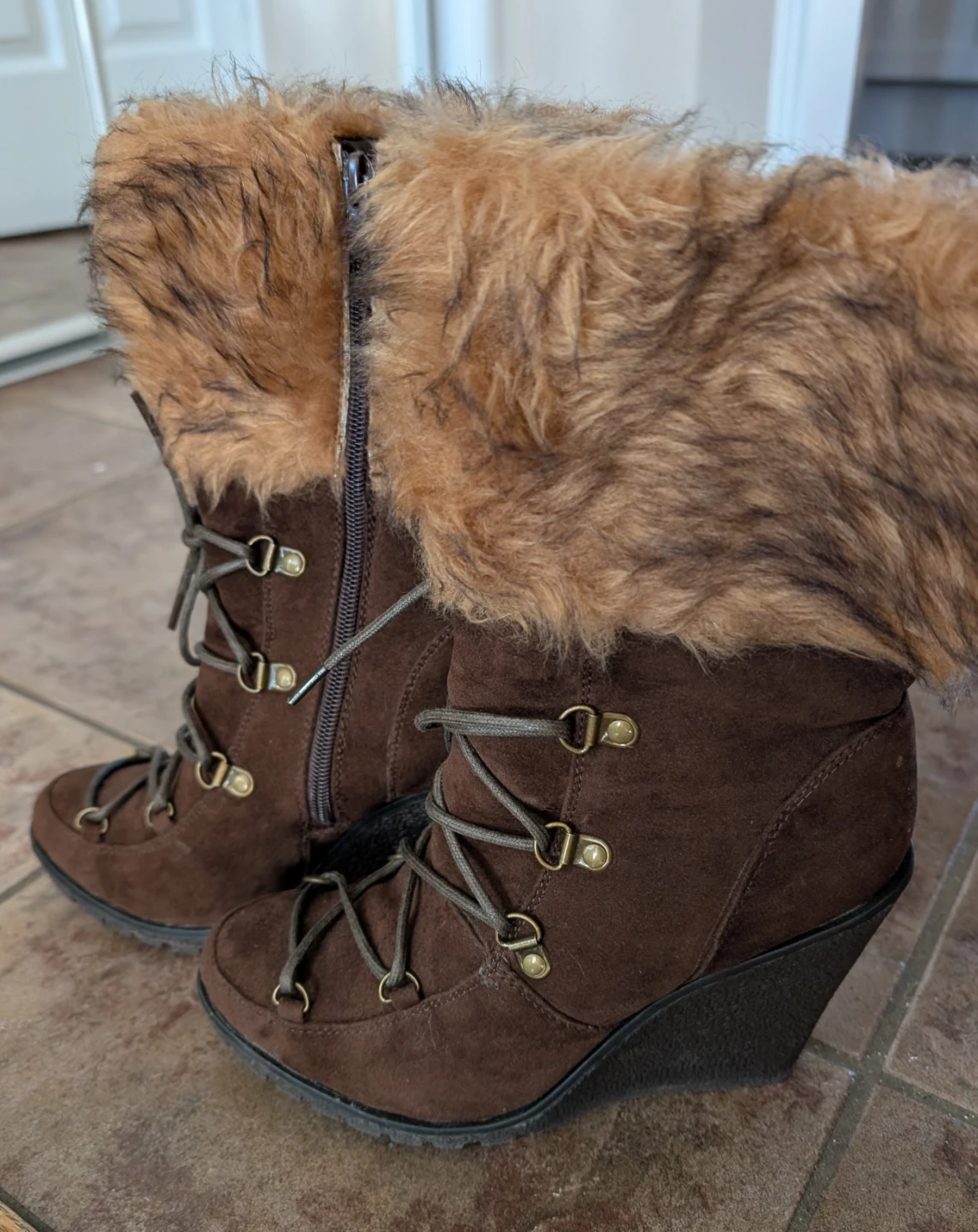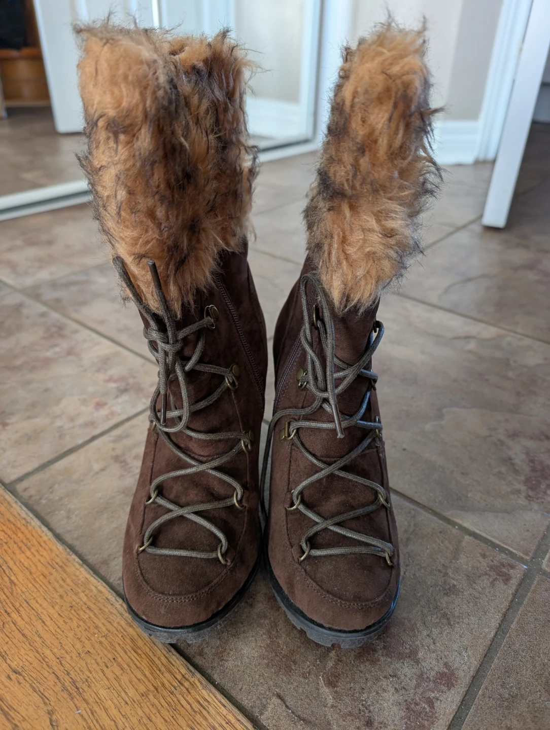 These are a pair of brown wedge heel boots, perfect for winter! They feature a faux fur trim and lace-up detailing. They look great and are in good condition!