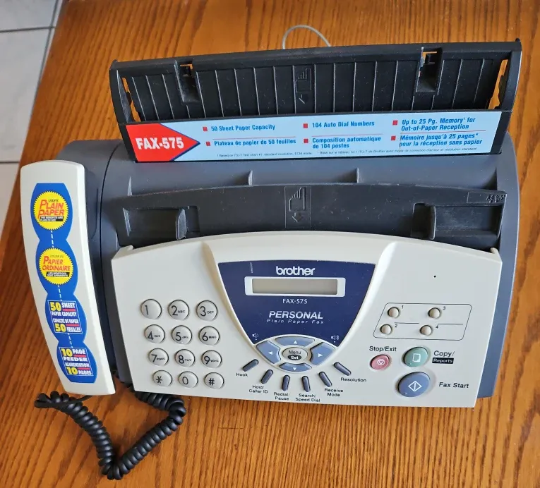 Selling a Brother FAX-575 personal plain paper fax machine. It has a 50-sheet paper capacity and 104 auto dial numbers. It also has up to 25 pages of memory for out-of-paper reception. Perfect for a home office or small business!