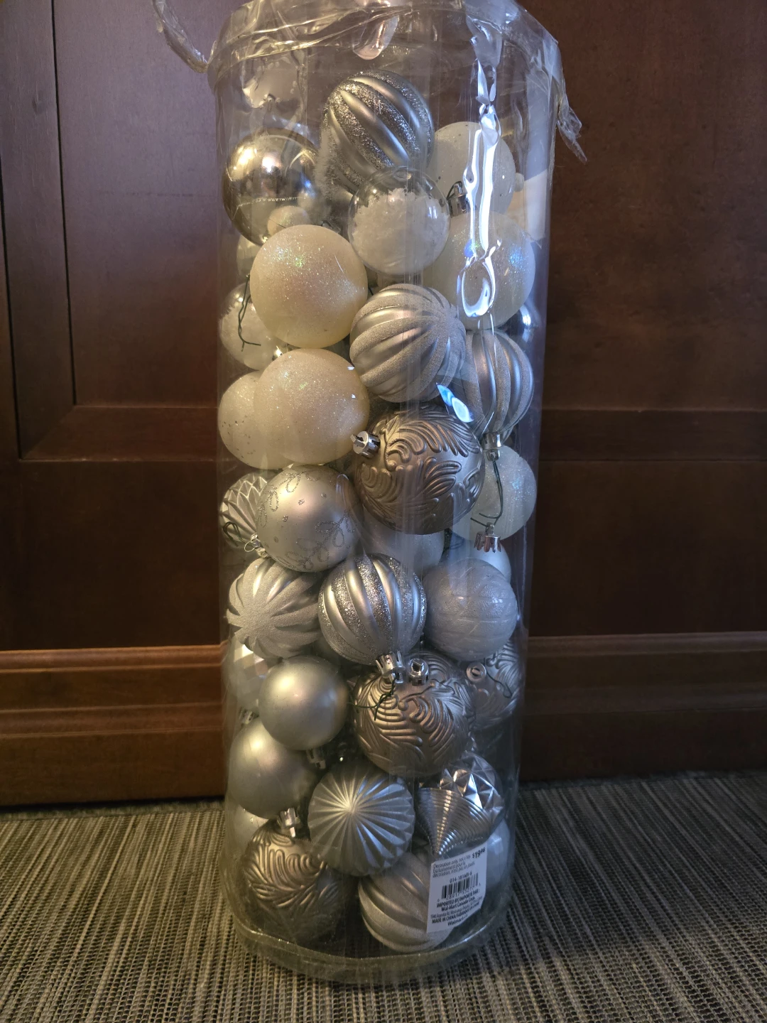 I have a tube of silver and white Christmas ornaments for sale. There are a variety of designs and finishes, including glittery, matte, and patterned ornaments.