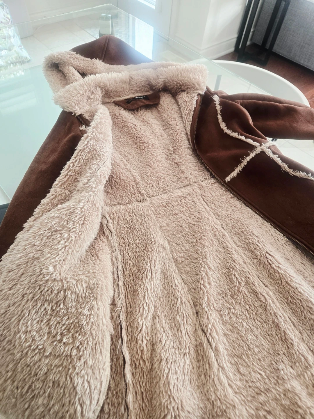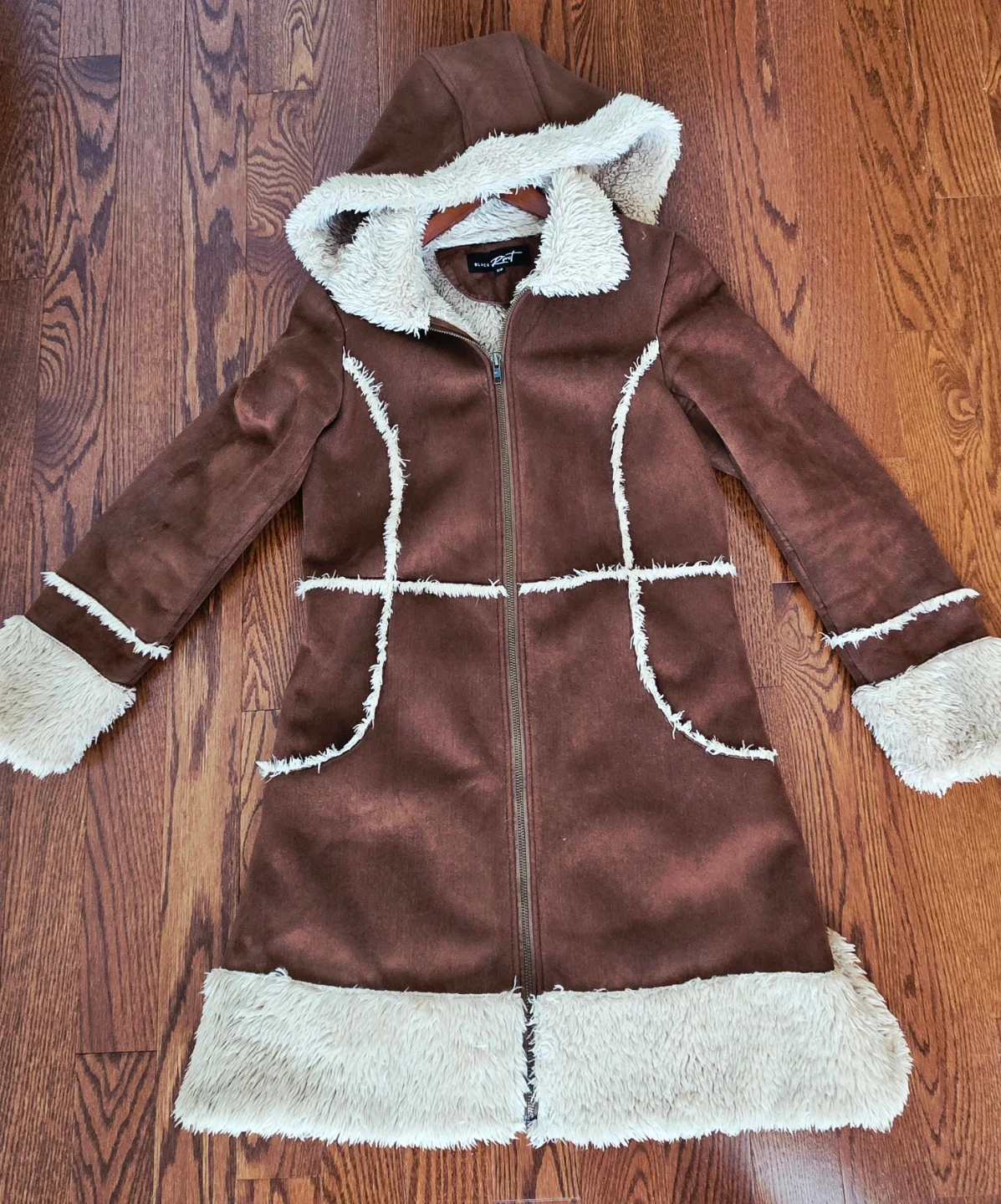 A cozy brown coat with faux suede exterior and fluffy fur trim! It's perfect for staying warm and stylish during the colder months. The coat features a hood and a zip-up front, making it easy to wear. The faux fur lining adds extra comfort and warmth