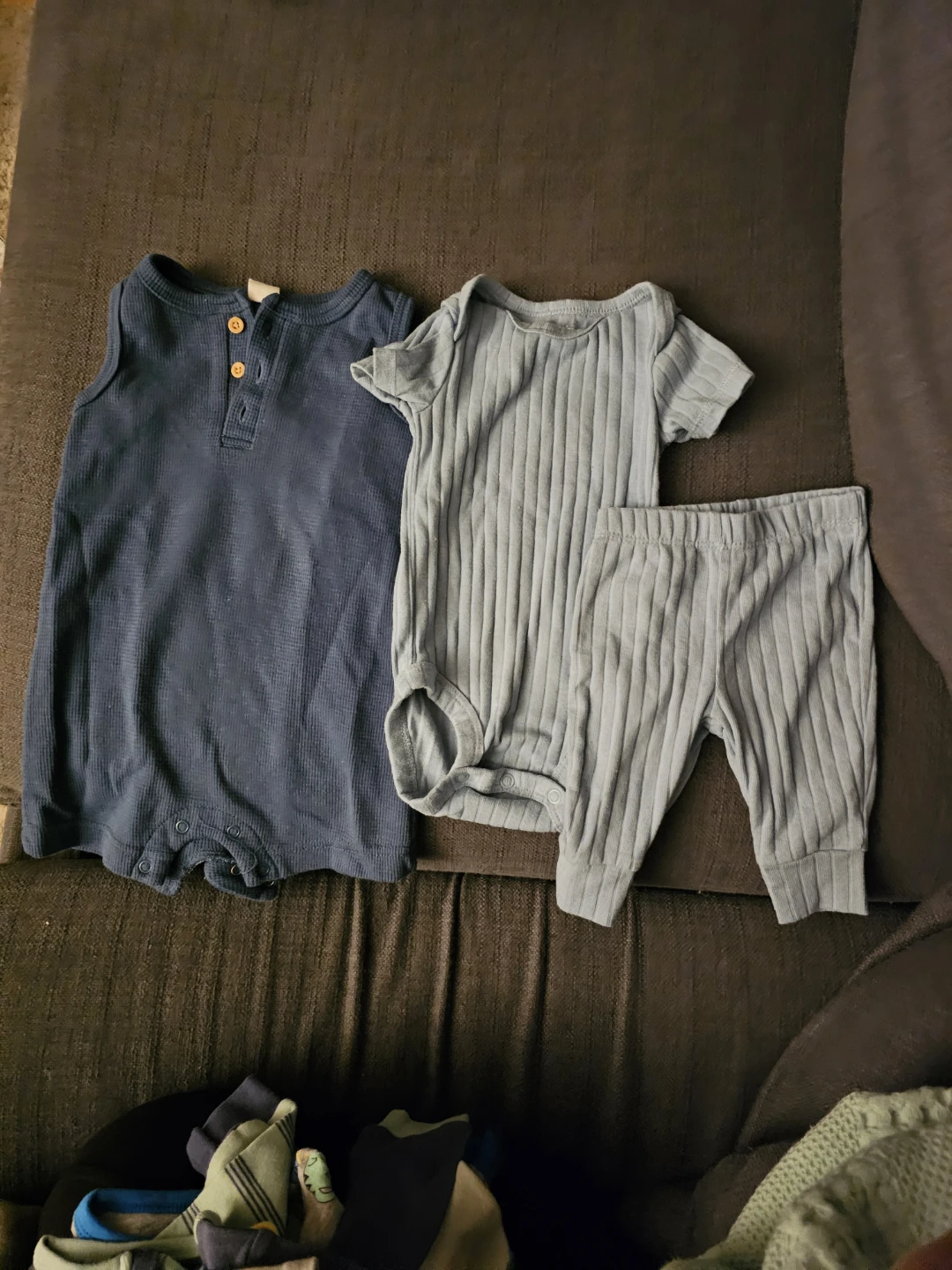 Giving away a cute little baby clothes bundle! It includes a navy blue romper and a light blue ribbed outfit with a onesie and pants. Perfect for your little one!