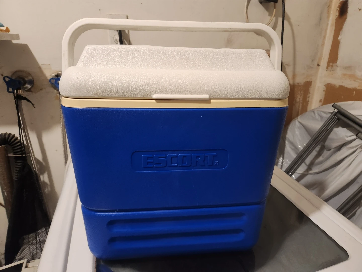 31 cm tall, 20 cm width, 34 cm width, blue hardcopy Escort brand cooler.