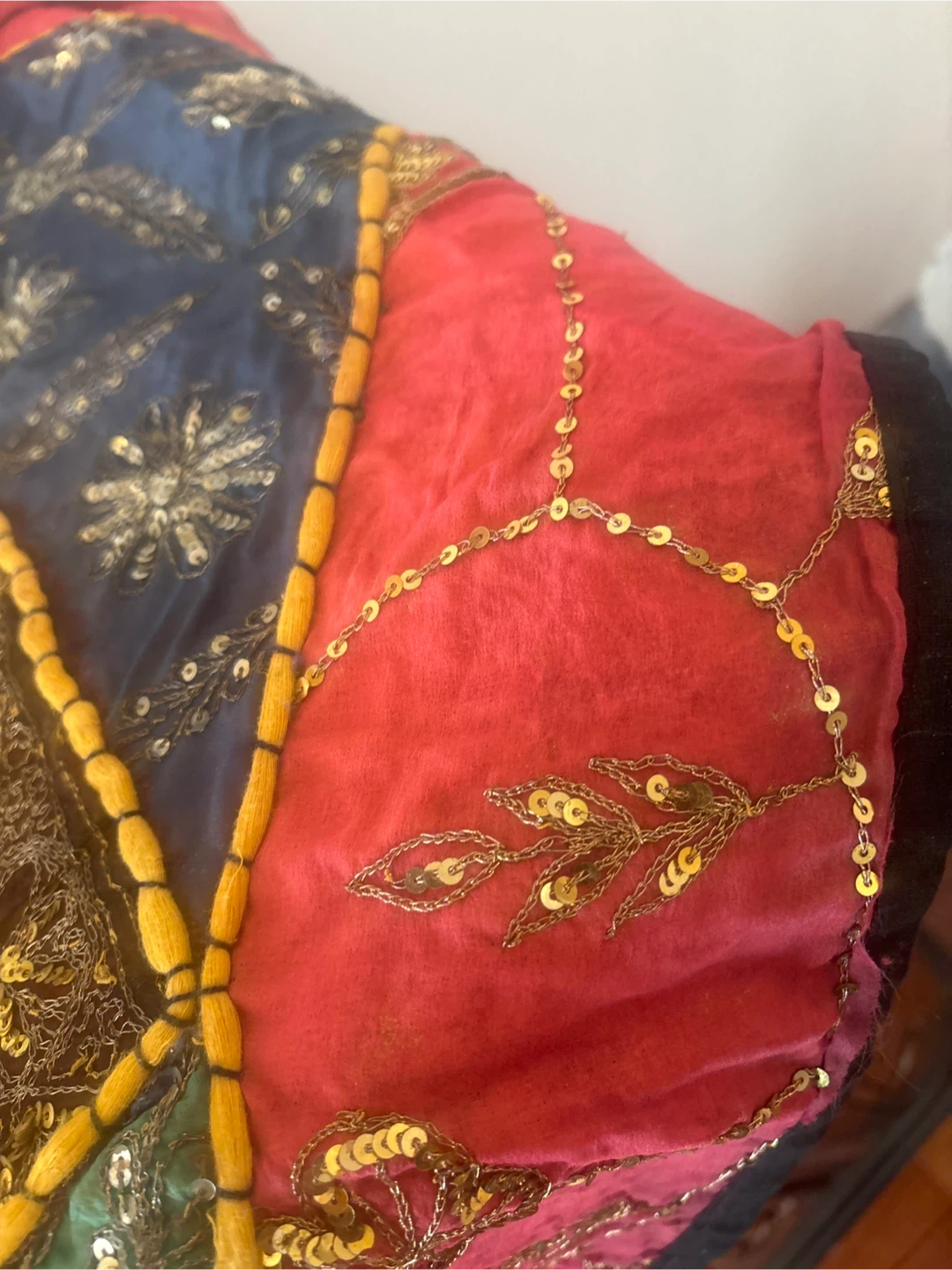 This is a beautiful decorative patchwork embroidered table cloth . It features a vibrant mix of colors and intricate sequin detailing. Perfect for adding a touch of bohemian flair to your home decor!