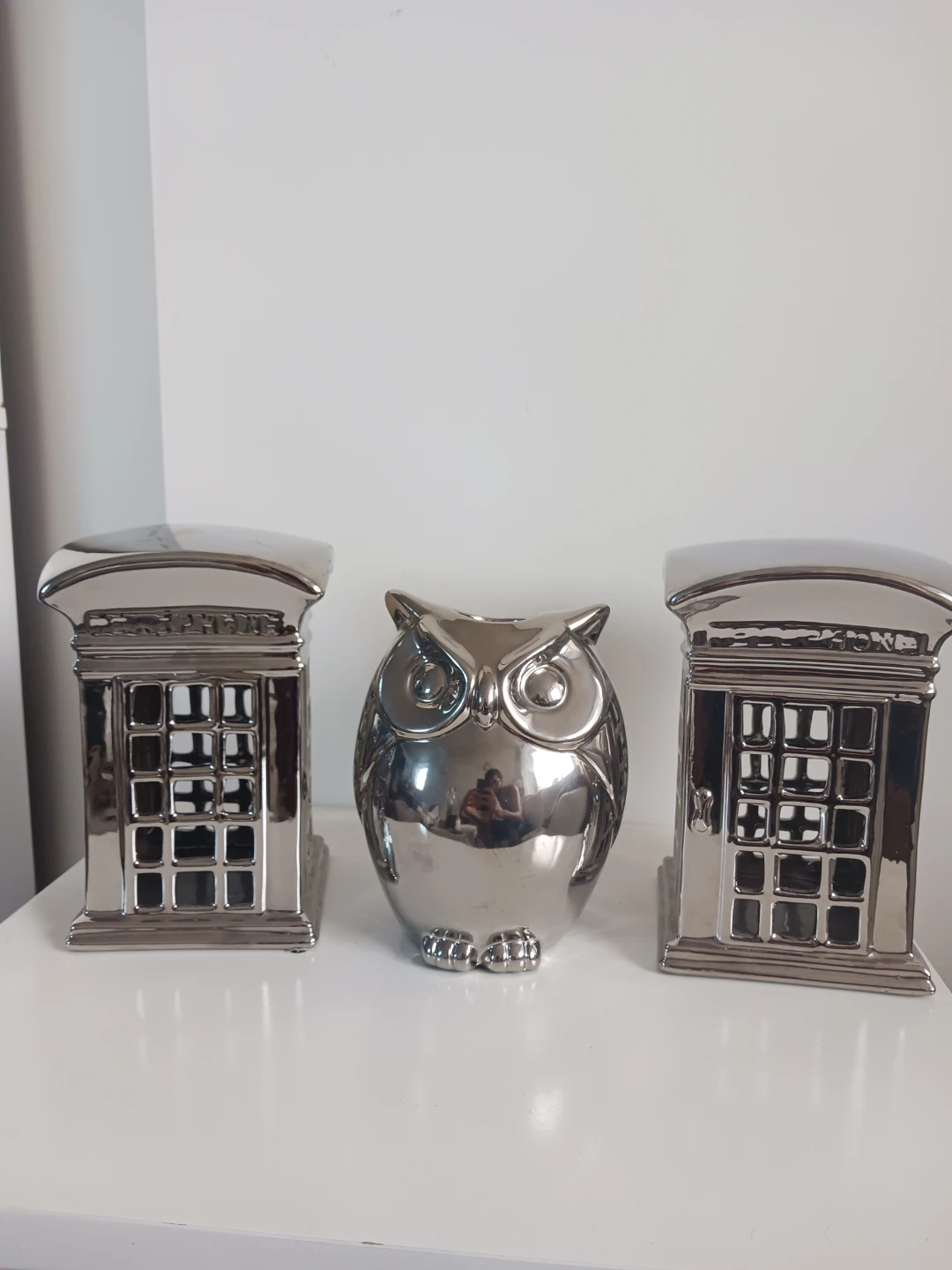 Add a touch of whimsical, modern flair to your space with this three-piece decorative set featuring a majestic, highly-polished chrome owl flanked by two stylized London telephone booth figurines. The reflective silver finish is bright, eye-catching, and perfect for a console table, shelf, or desk.