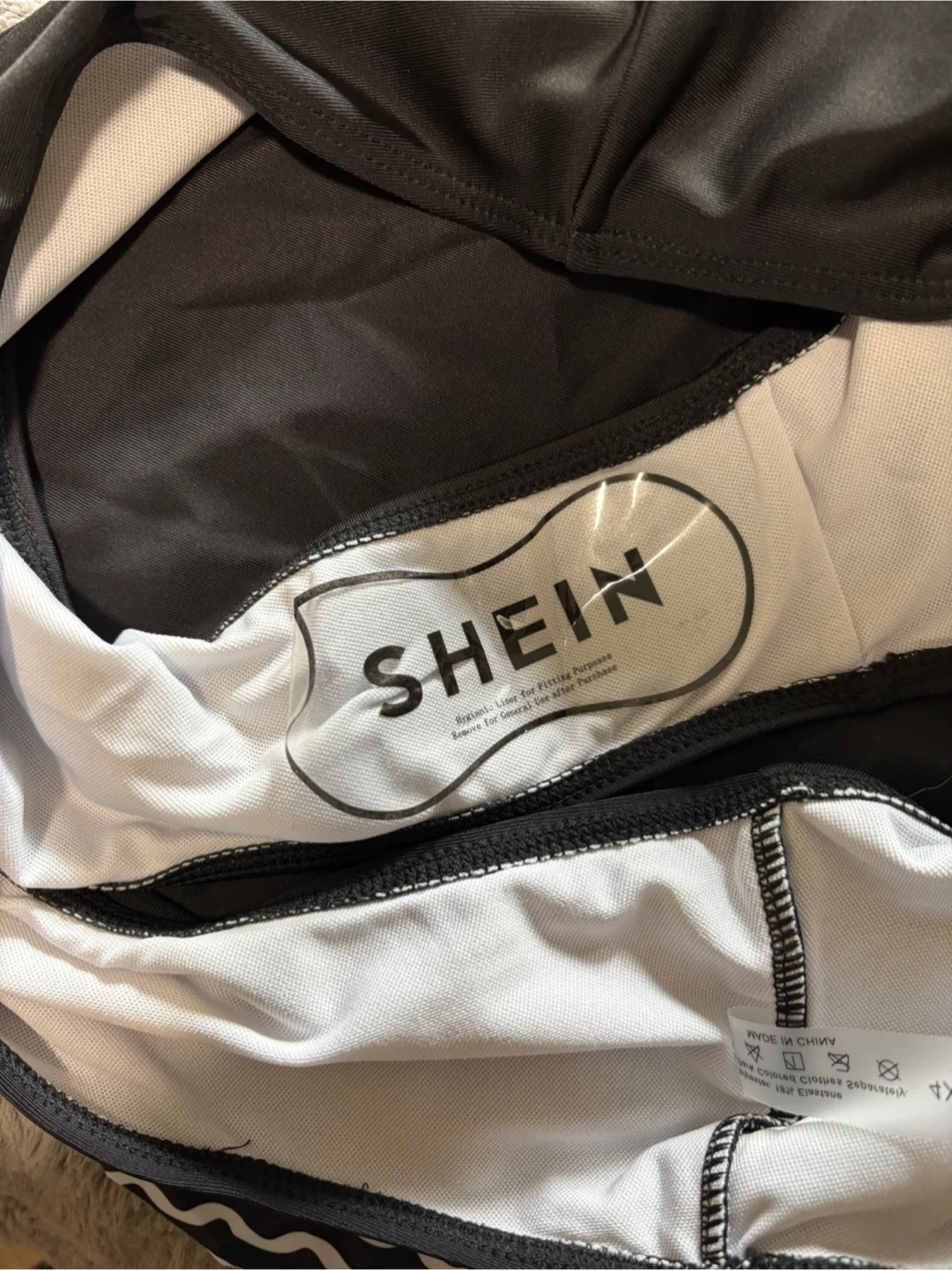 Selling a Shein swimsuit in black and white. It's in great condition and ready for the summer season! The swimsuit features a stylish design with a black bottom and a black and white patterned top.