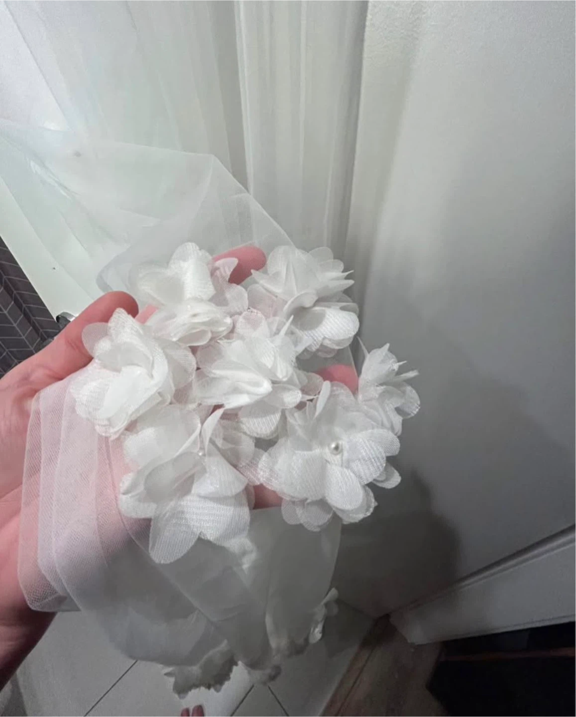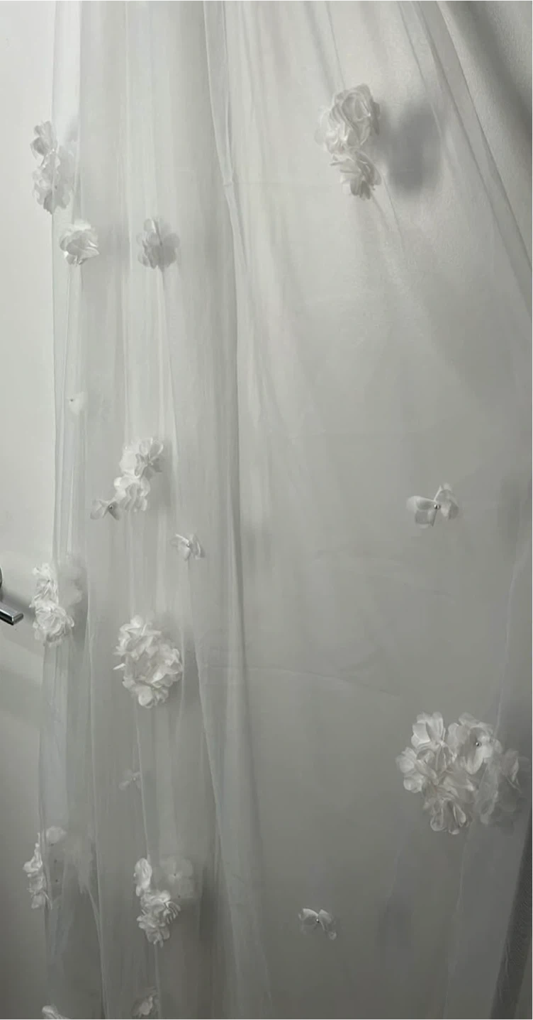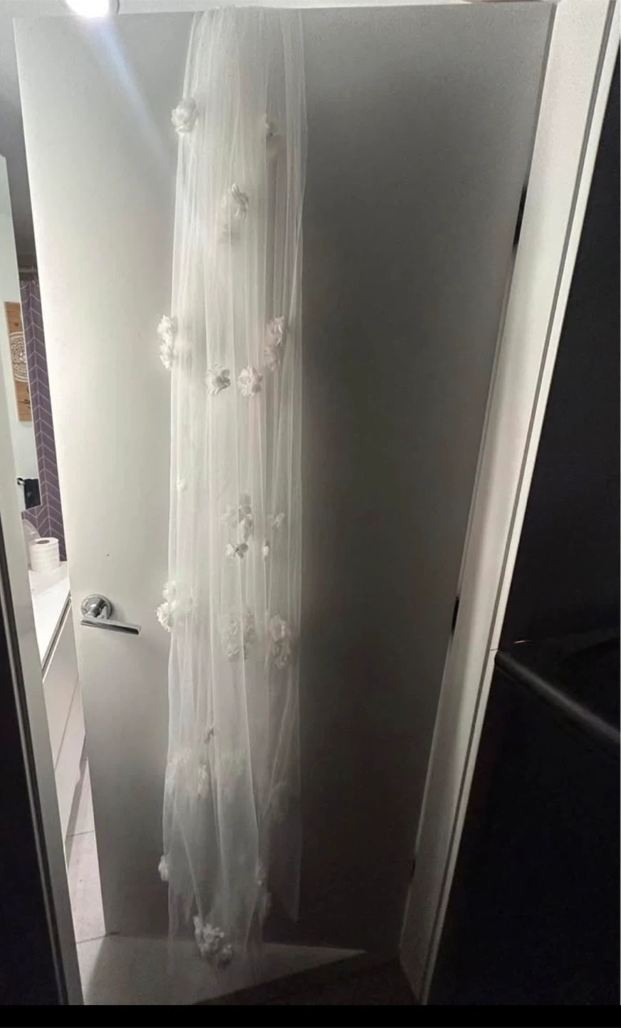 Selling a beautiful white wedding veil! It features delicate floral appliqués throughout. The veil is in great condition and would be perfect for your special day