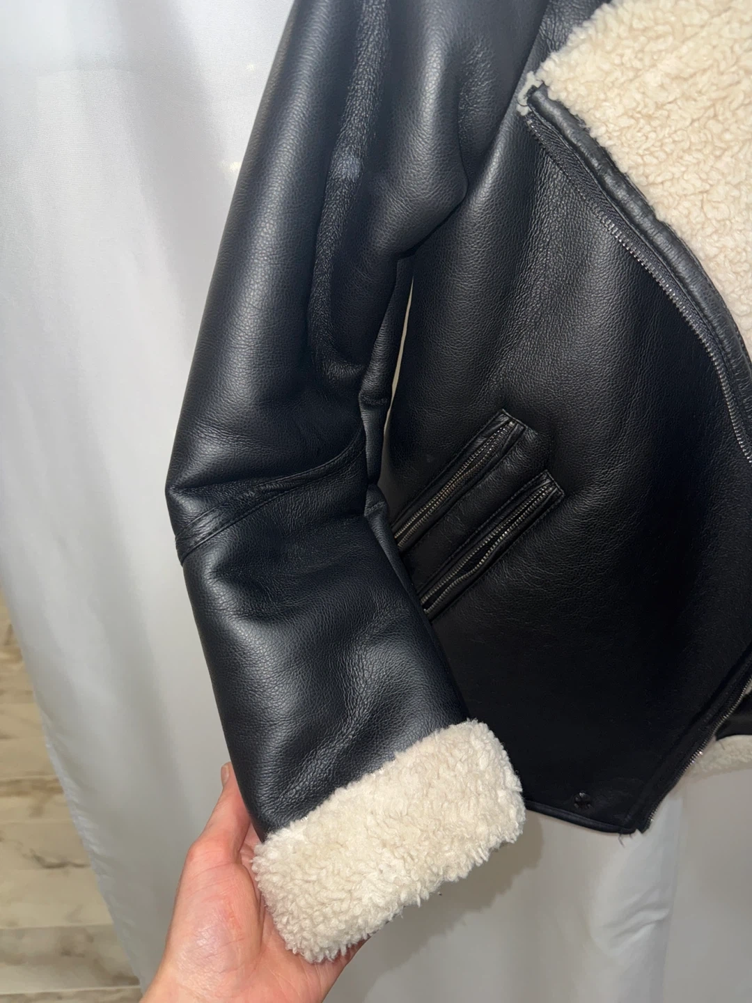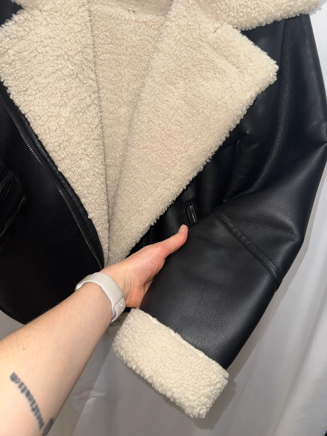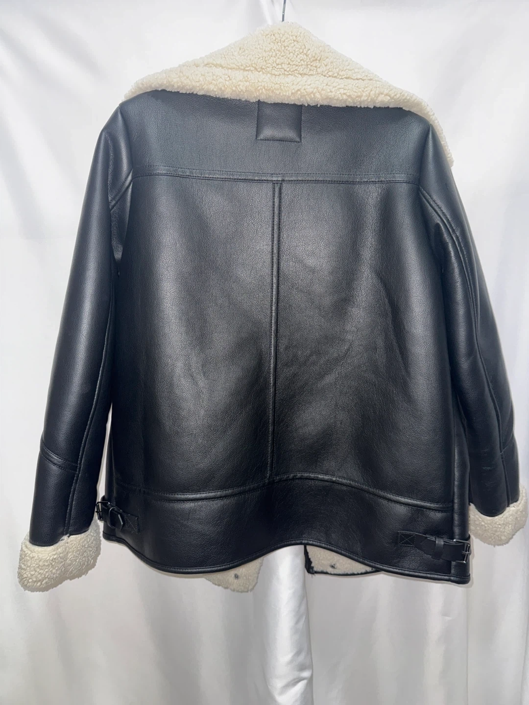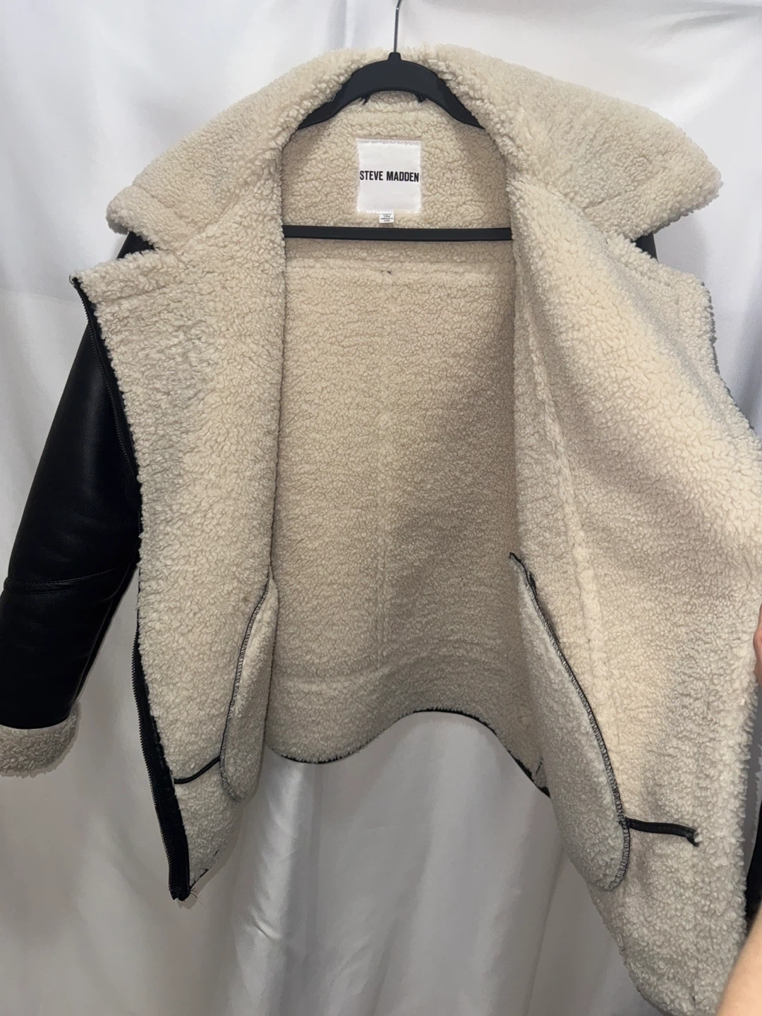 Here's a stylish Steve Madden aviator jacket! It's made of black faux leather with a cozy, cream-coloured sherpa lining. Perfect for staying warm and looking great!