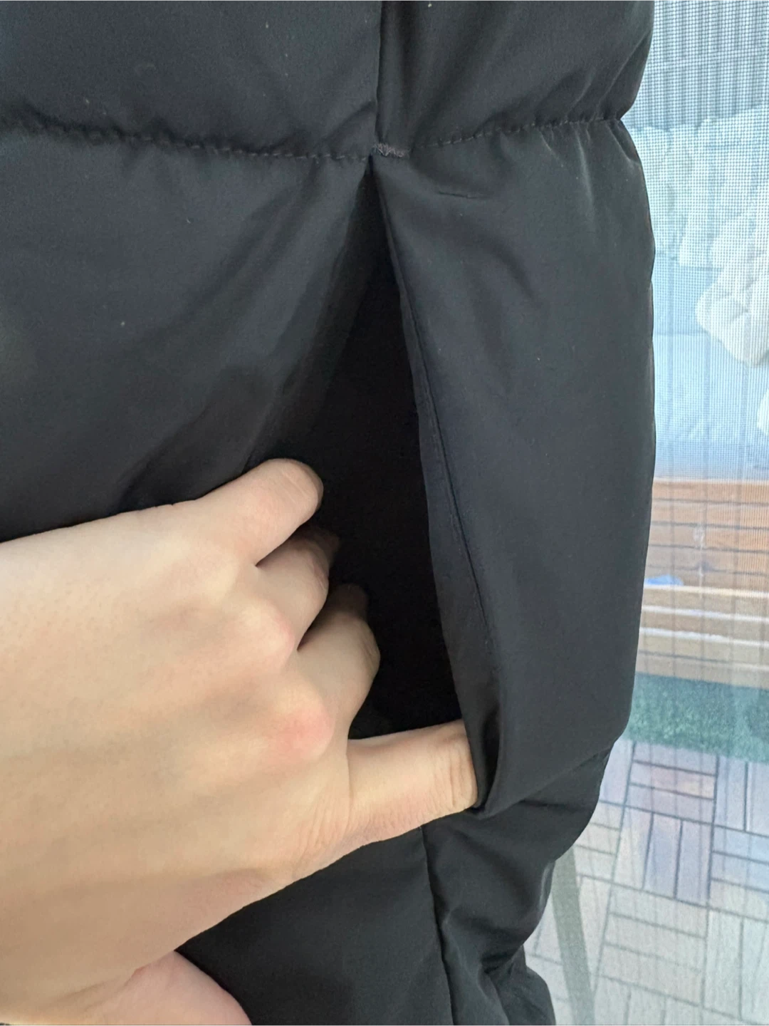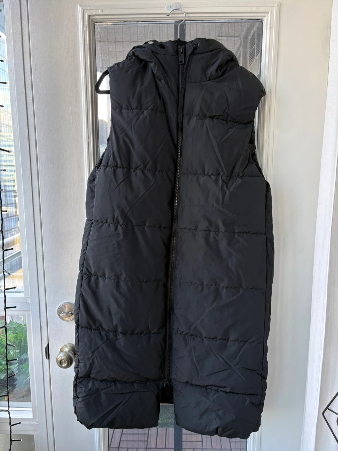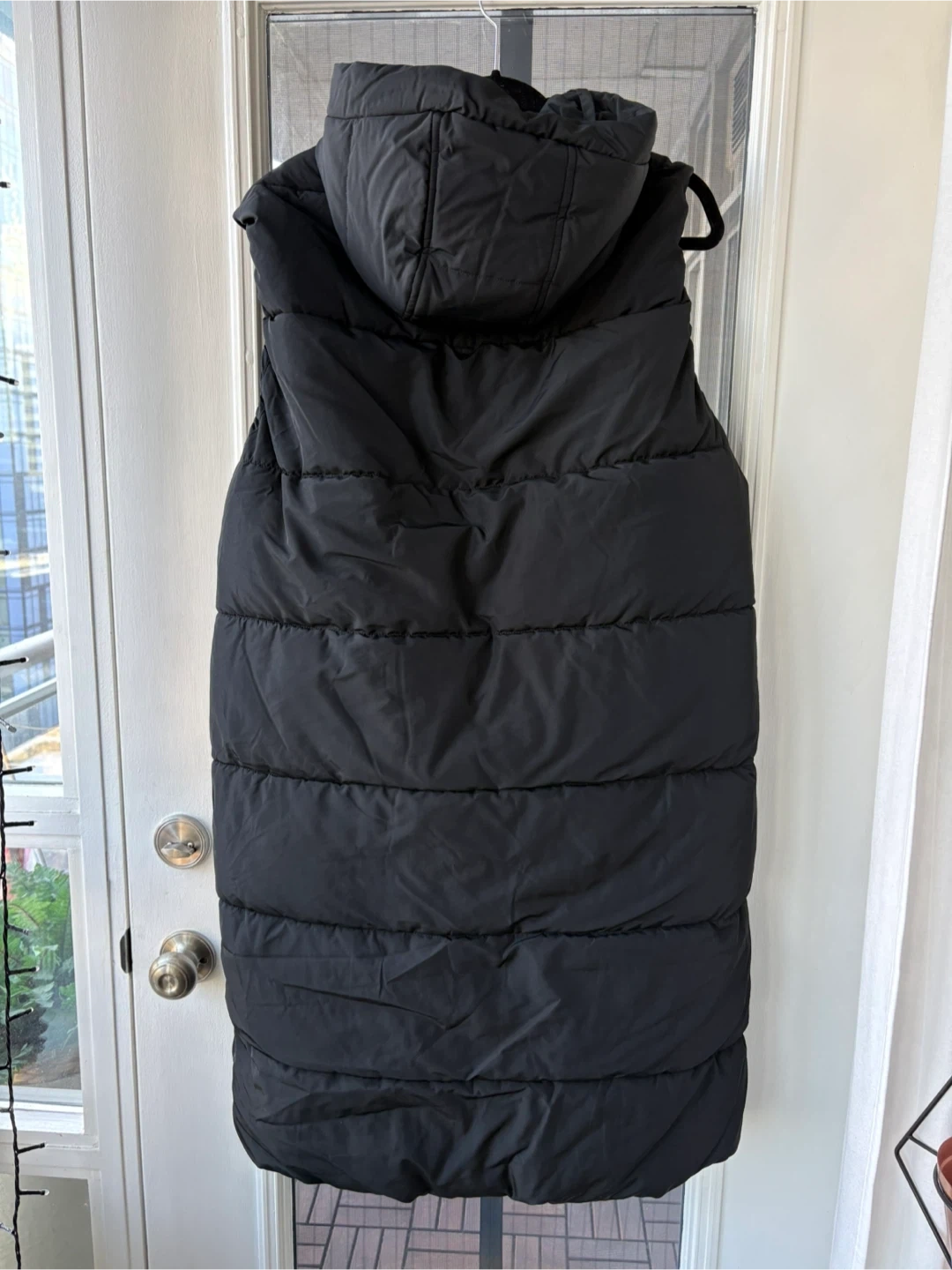 Selling a comfy black puffer vest! It's in great condition and perfect for layering during those in-between weather days. Has a nice hood and pockets too! Full zip, drawstring hood, knee length. Size small but fits like a medium