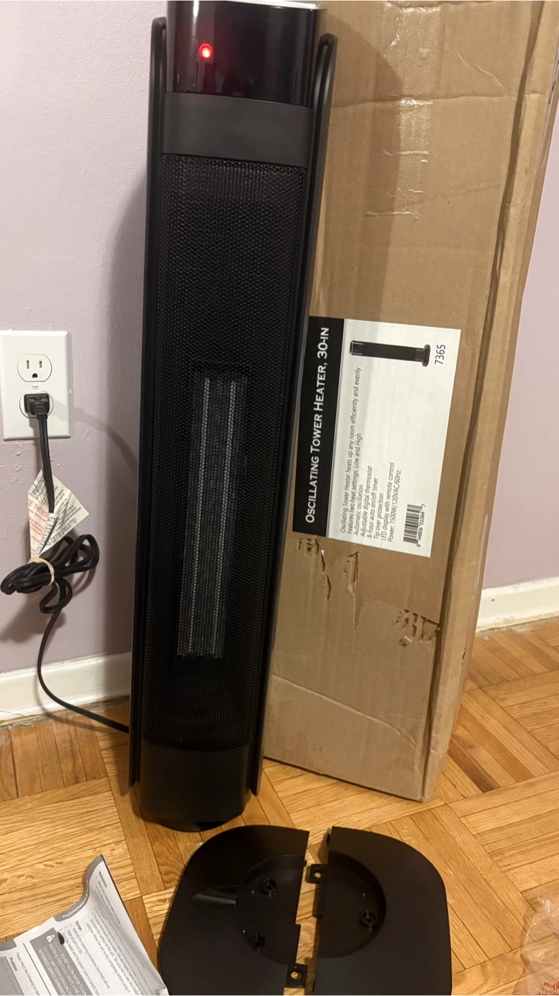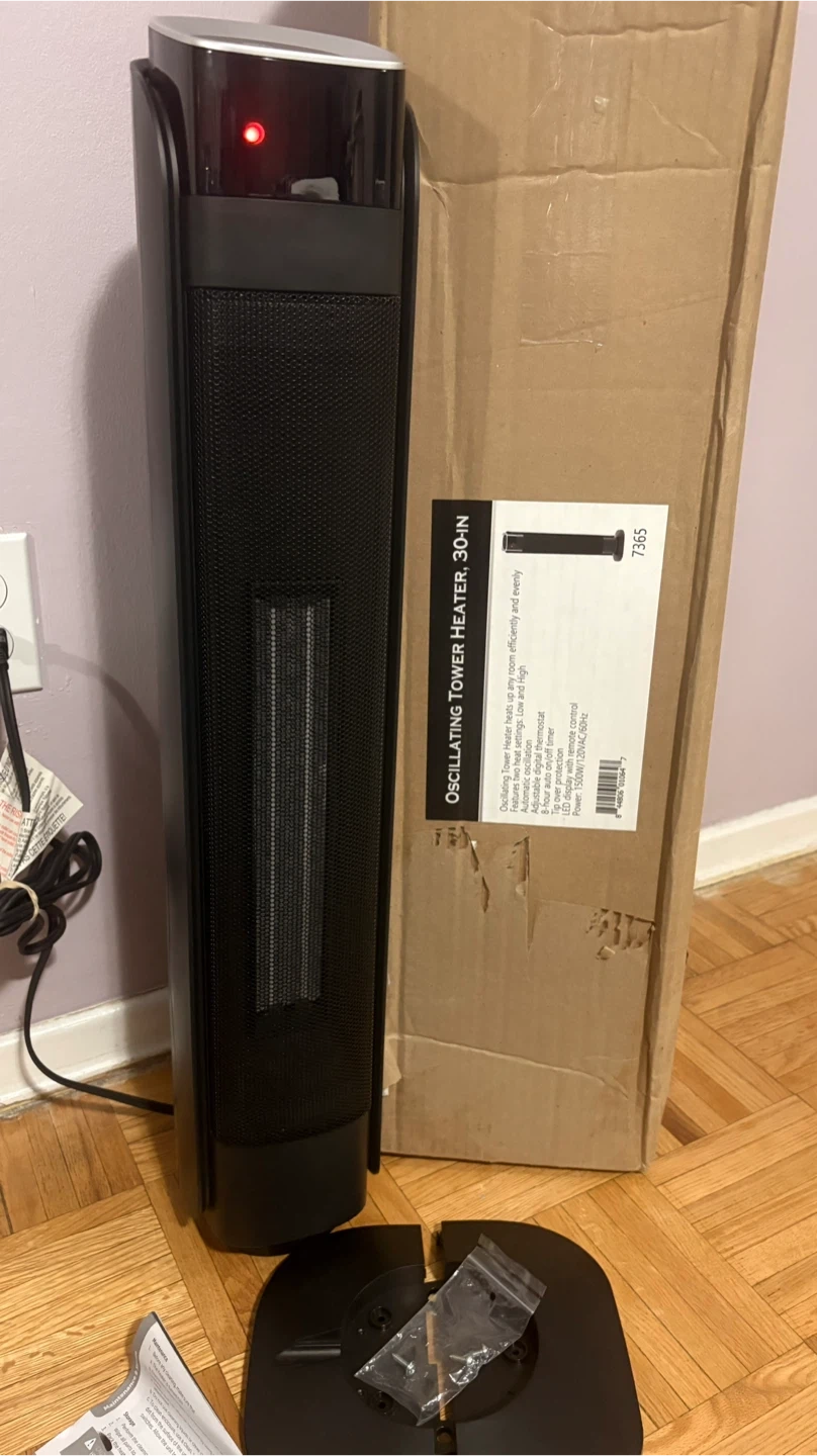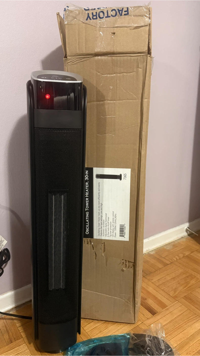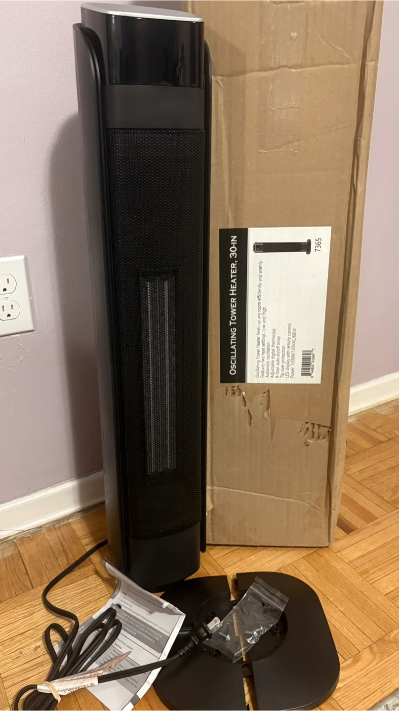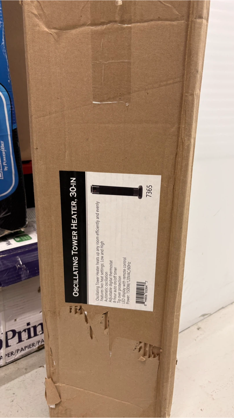 Selling a brand new Oscillating Tower Heater, still in its original box! It stands 30 inches tall and heats rooms efficiently and evenly. It features automatic oscillation, adjustable digital thermostat, and an 8-hour auto-off timer. The heater also has tip-over protection and an LED display with remote control. Power: 1500W/120V AC/60Hz