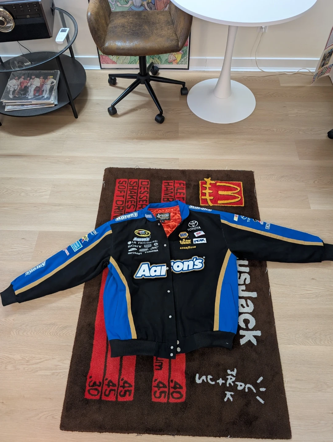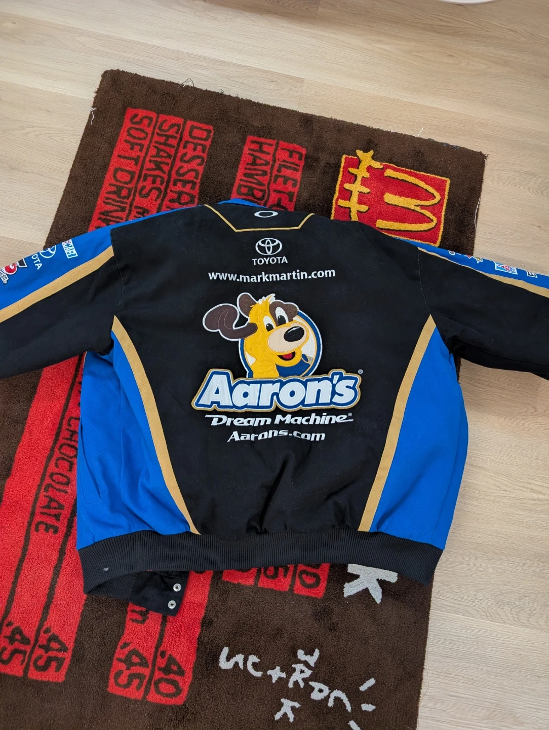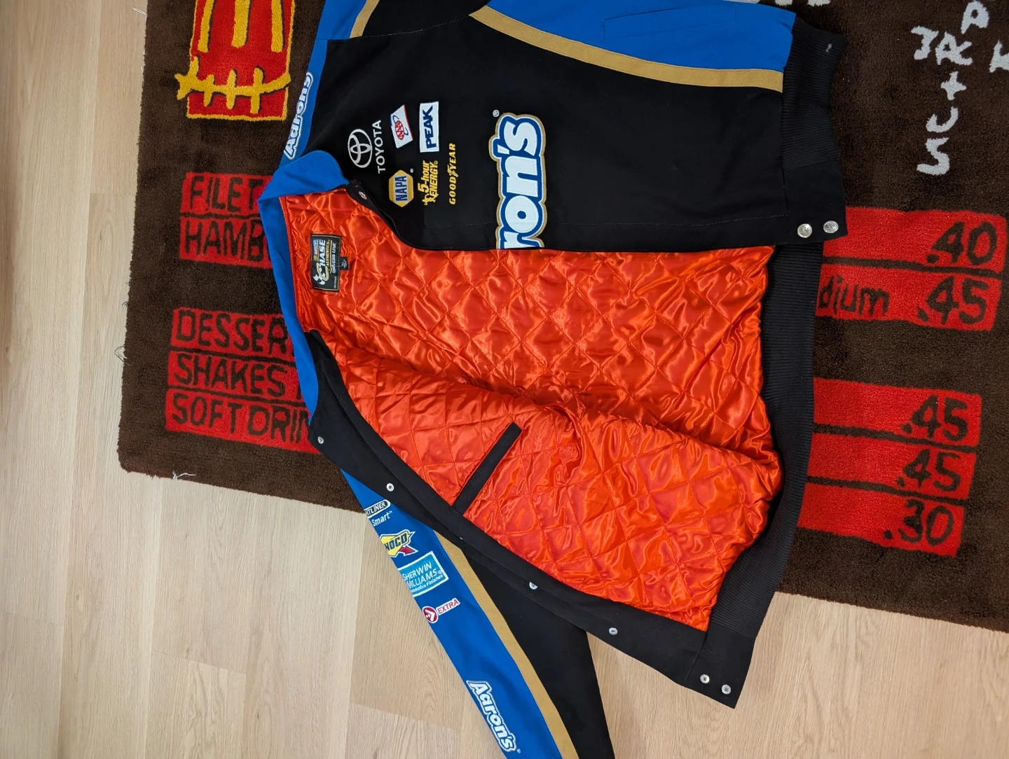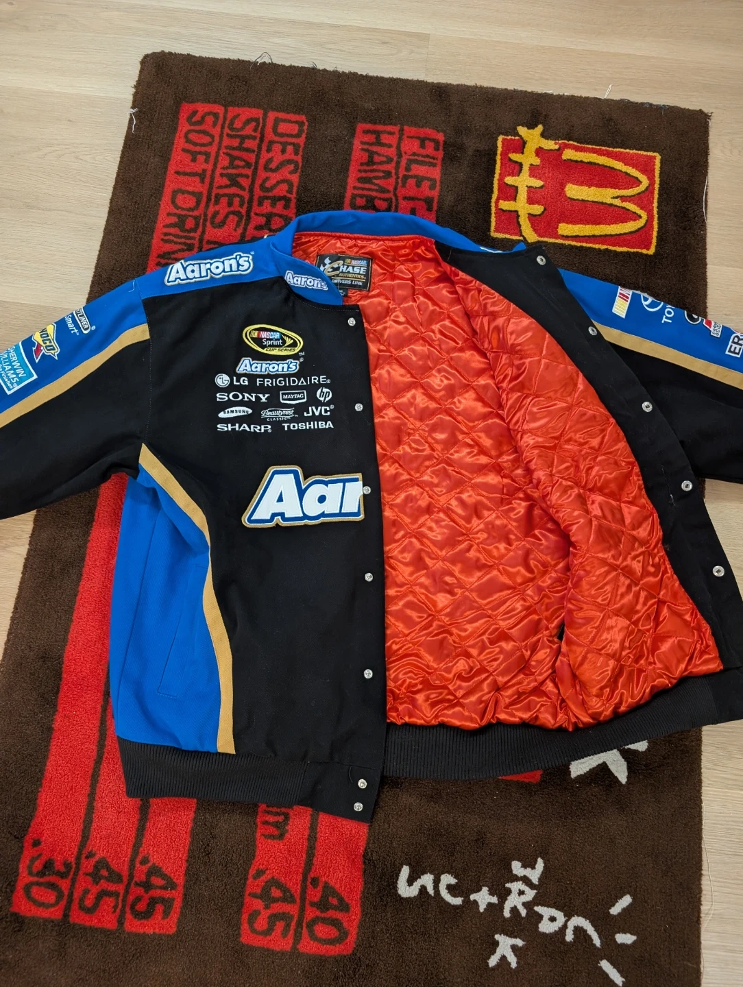 Here's a cool Aaron's NASCAR racing jacket! It features logos from various brands like Toyota, Goodyear, LG, Sony, and more. The jacket is black and blue with gold accents and has an orange quilted lining. It's in great condition and ready for a new owner!
