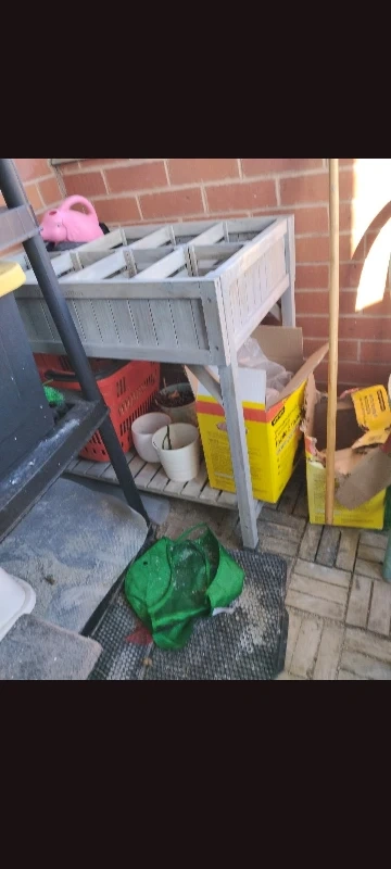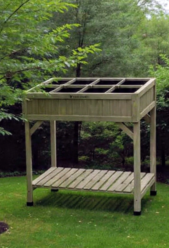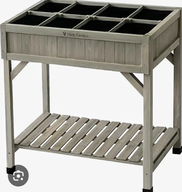 I'm selling a V Herb Garden elevated planter box. It's perfect for gardening without bending over! The planter has a nice grey wood finish and a lower shelf for storing your gardening tools or supplies. It's in good condition and ready for your herbs or πΊ πΉ