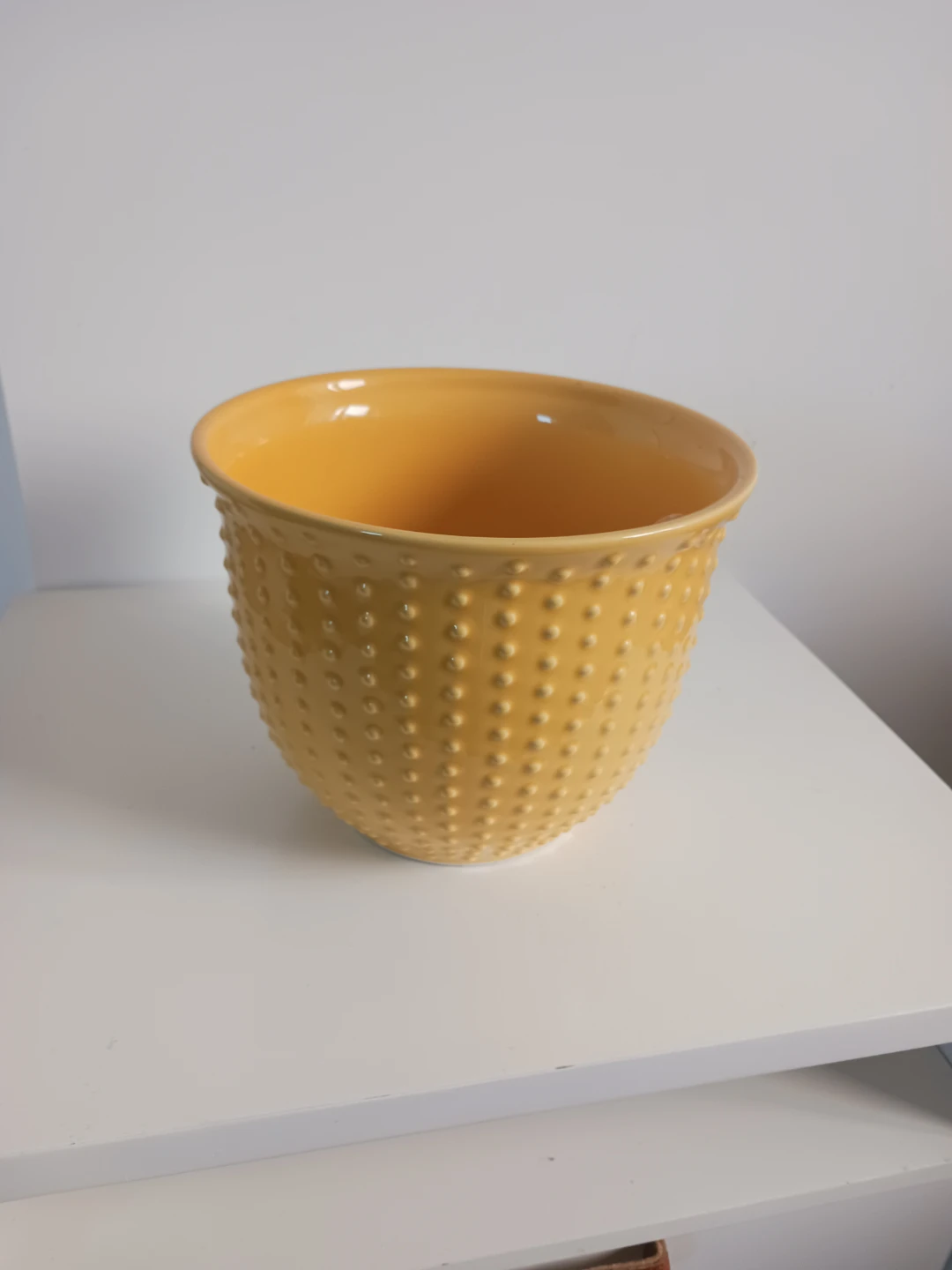 Add a vibrant pop of color to your home with this beautiful sunny yellow ceramic planter. It features a unique, eye-catching bobble/dimpled texture that gives it a modern, playful feel. This pot is perfect for holding house plants, succulents, or simply serving as a colorful decorative accent on a shelf or table.