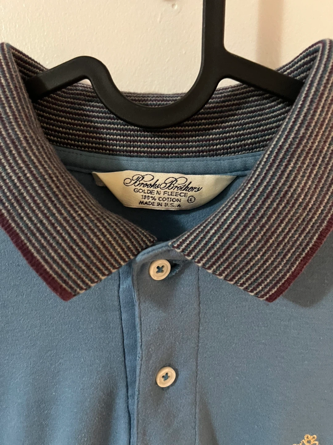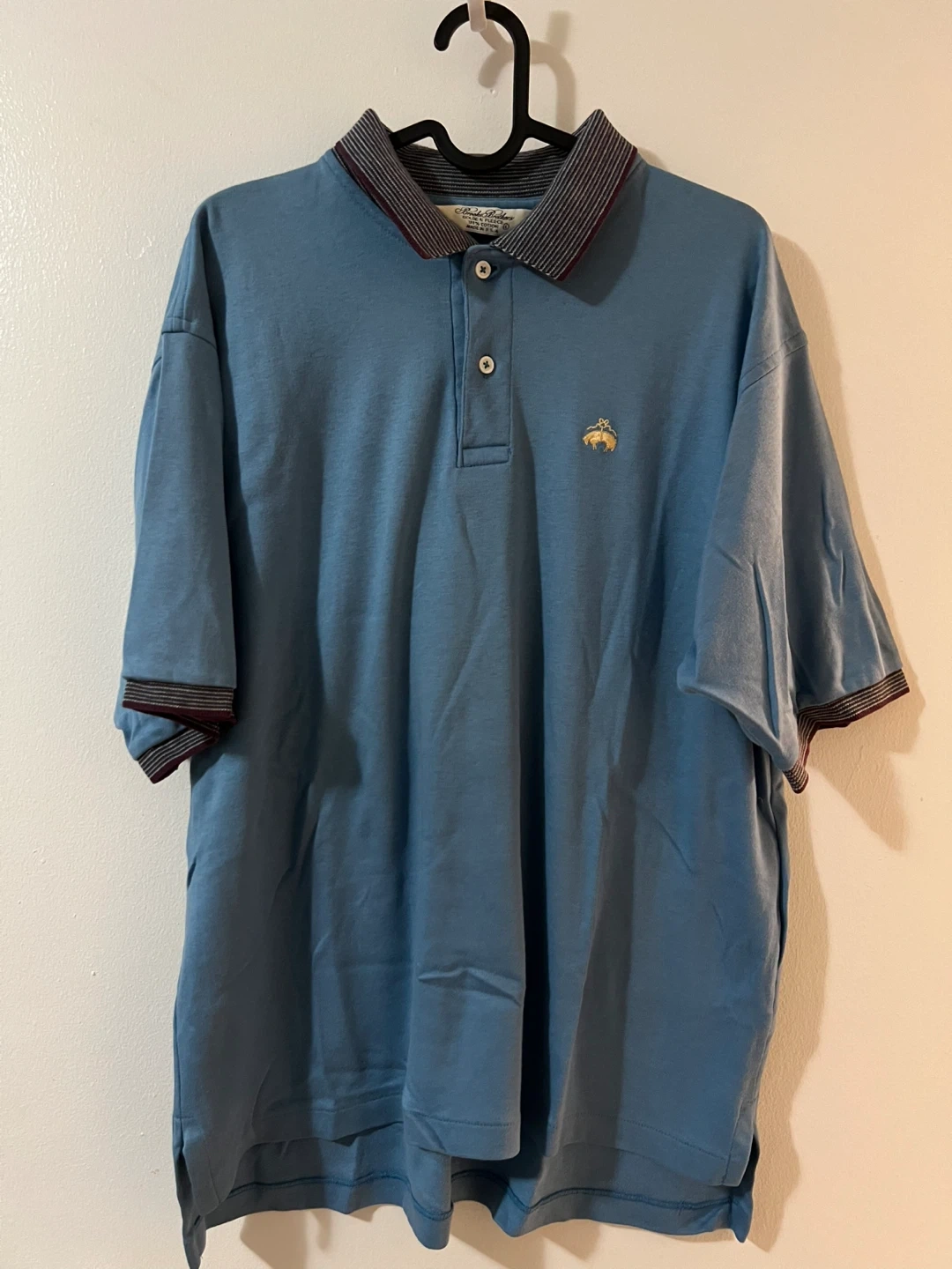 Here's a Brooks Brothers polo shirt in size large. It's made of 100% cotton and has a cool, classic look. The colour is a nice light blue. Perfect for a casual day out!