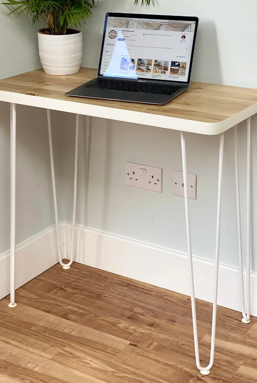 Selling a desk with a wood top and white metal hairpin legs. It's a simple and stylish desk that would work well in a home office or bedroom. The top appears to be a light wood tone, and the legs are a clean white colour. It's in good condition and ready for a new home!