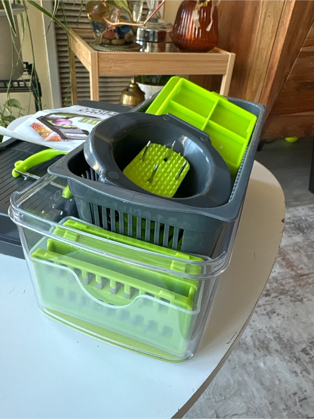 Selling a multi-functional one-piece vegetable cutter. It comes with various attachments for different cutting styles. It's in great condition and ready to help you prep your veggies with ease!