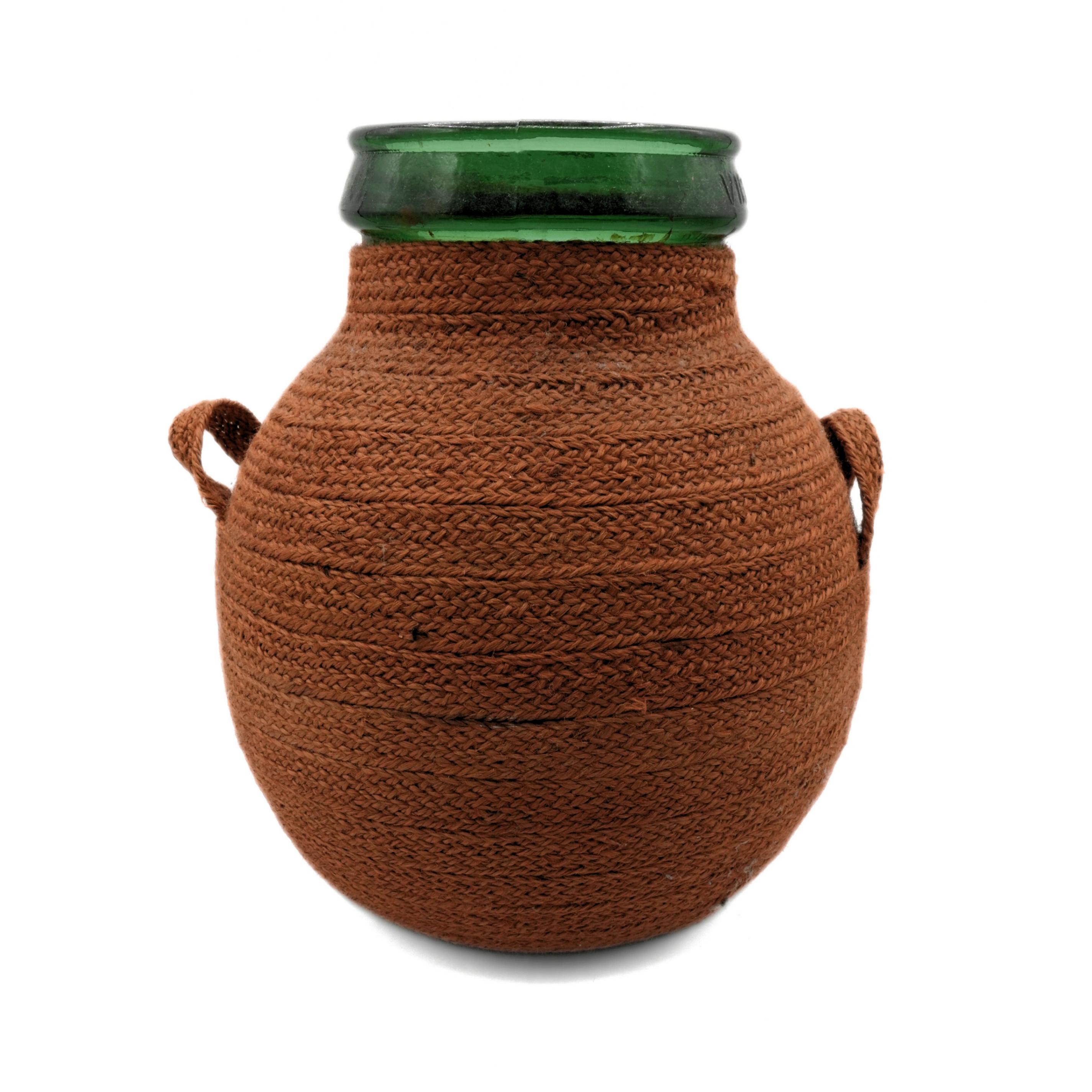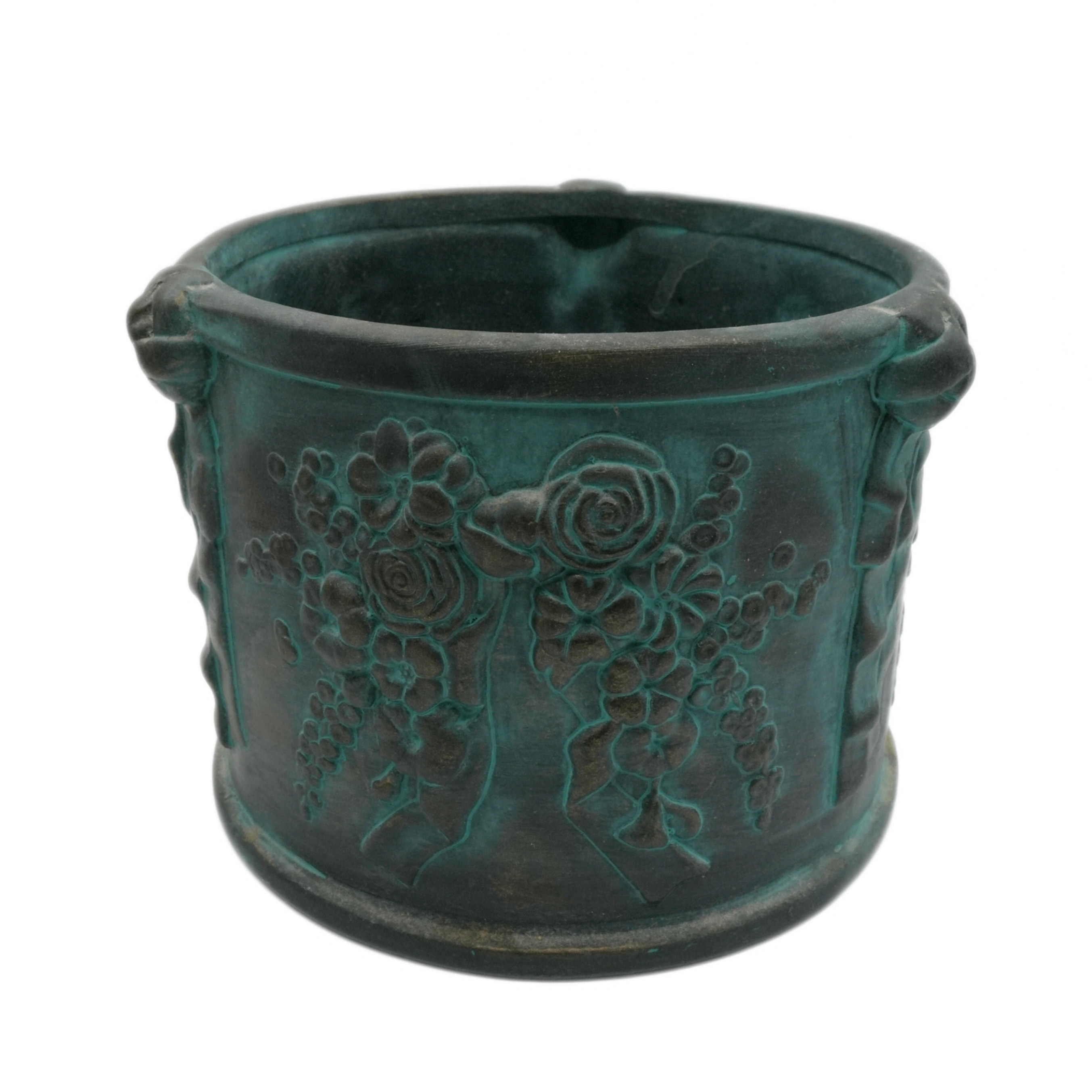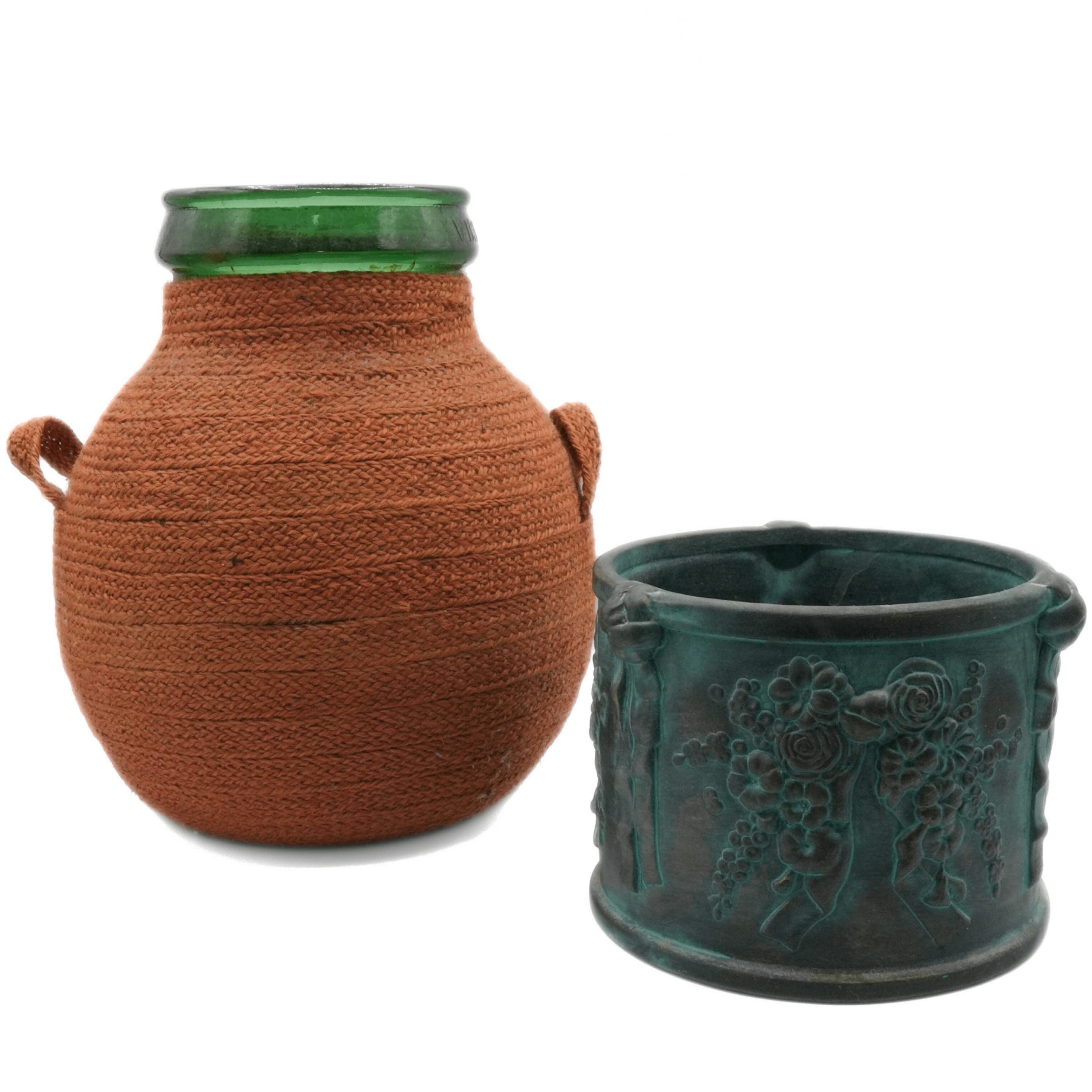 Selling a decorative planter and vase set. The planter has a beautiful floral design and the vase is wrapped in a textured material. Perfect for adding a touch of charm to your home or garden!