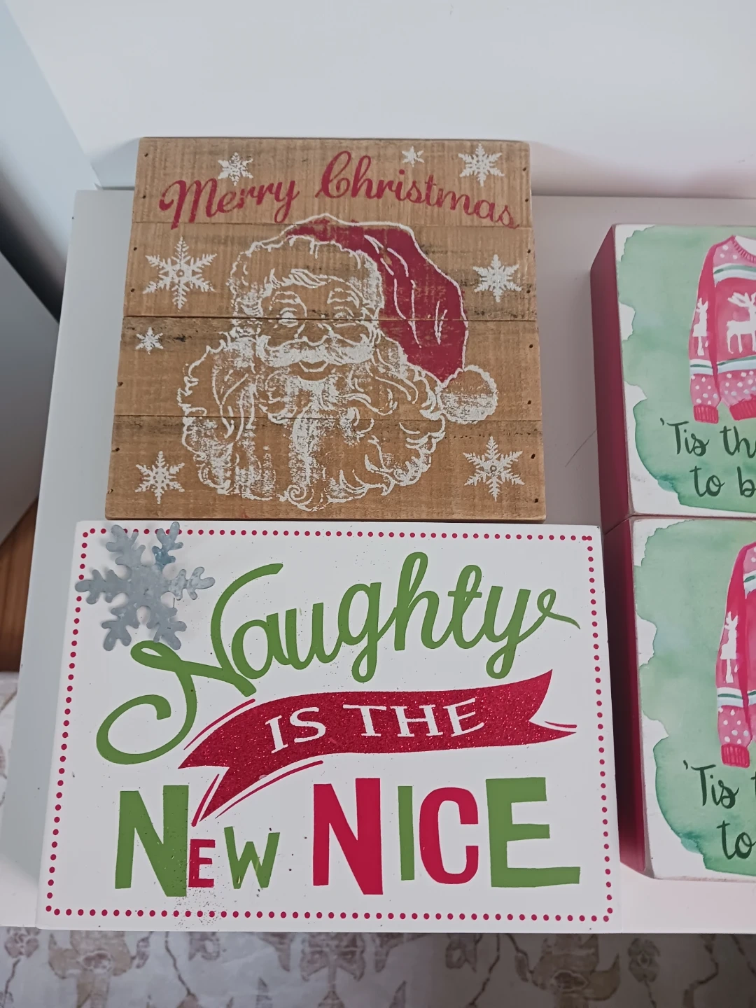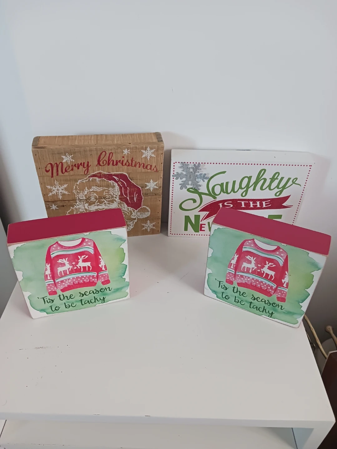 Get ready for the holidays with this fun 4-piece sign bundle! Perfect for adding a festive and humorous touch to your mantel, entry table, or holiday shelf display. The set includes a rustic "Merry Christmas" Santa sign, a playful "Naughty is the New NICE" sign, and two matching blocks celebrating the "tacky" Christmas sweater trend.